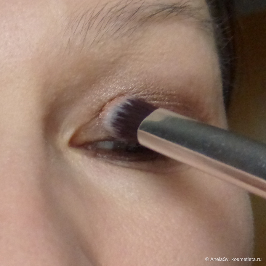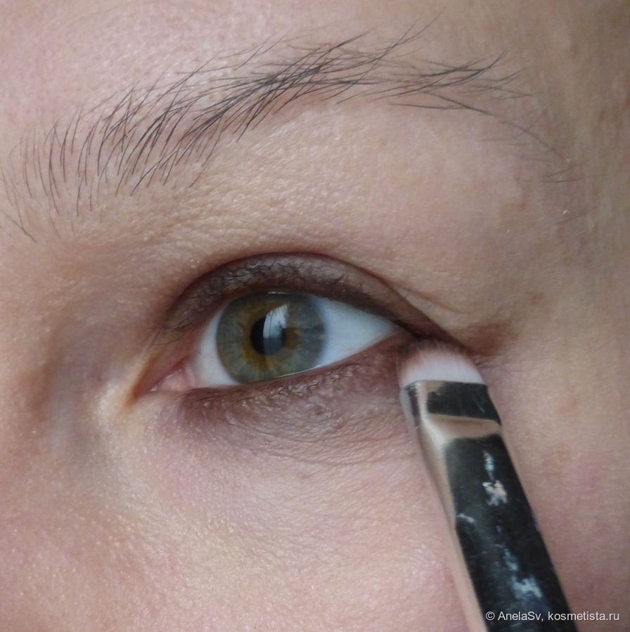 3.На середину века нанесла праймер, а на него — тёмную сияшку Sephora, а ближе к внешнему уголку глаза — от Estee Lauder.