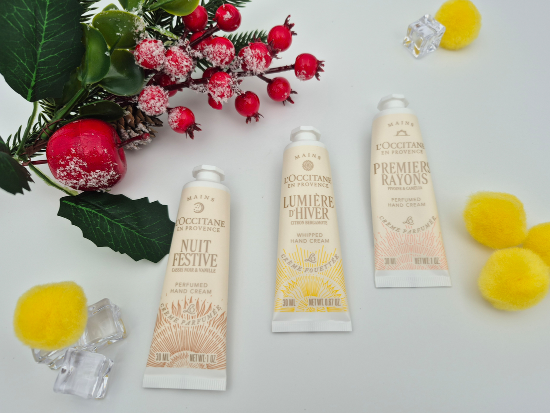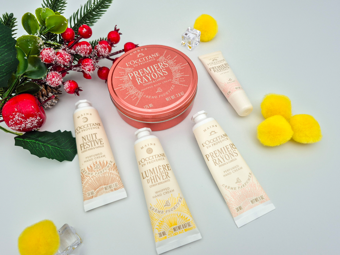 Новогодняя коллекция в этом году состоит из 3 линеек с ароматами Lumiere D’Hiver, Nuit Festive и Premiers Rayons. Взяла себе как обычно кремы для рук, крем для тела, бальзам для губ и пару расходников в виде масла и крема для душа.