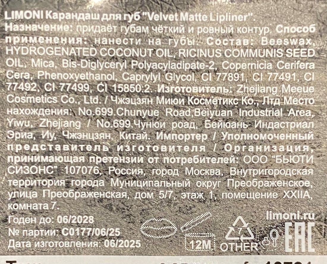 Карандаши для губ произведены в России. Срок годности после вскрытия 12 месяцев.