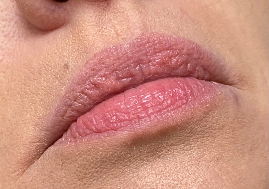 На фотографии видно три «состояния» (слева направо): Только контур; Губы полностью закрашены карандашом; Губы полностью закрашены карандашом + прозрачный блеск сверху.