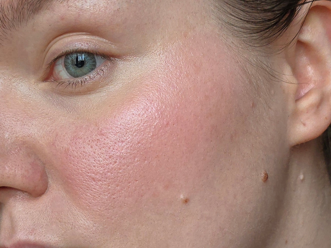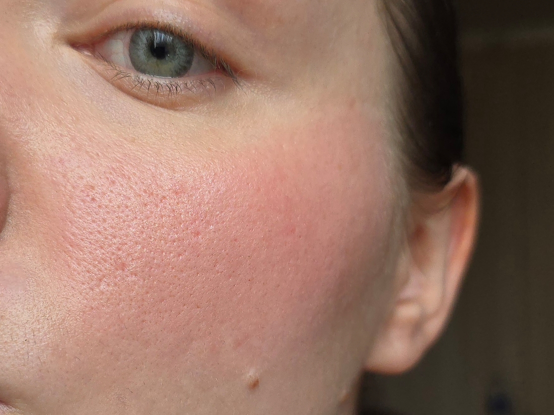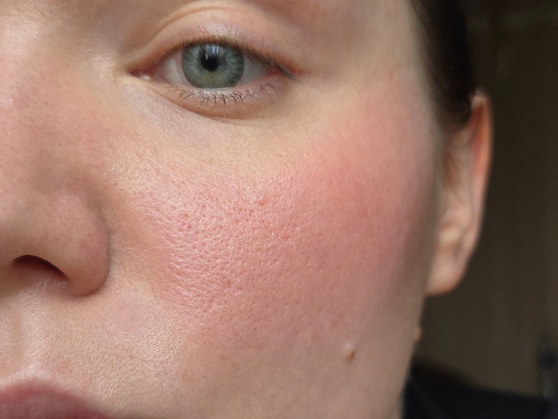 У меня на коже, кроме расширенных пор, есть атрофические (углубленные) шрамы. При нанесении ярких румян они выглядят более тёмными цветовыми пятнами на фото. Это не вина румян, просто особенность рельефа, они и на коже без ничего выглядят темными.