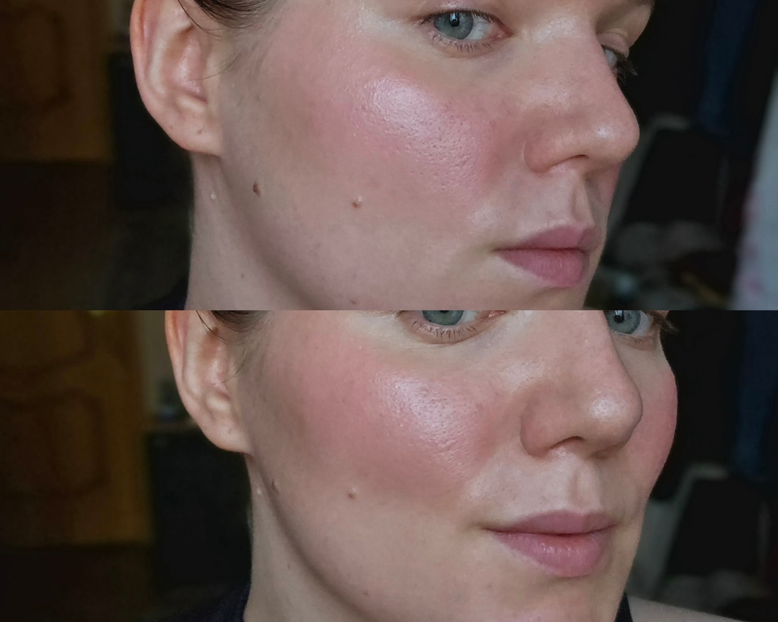 Что же тот самый серебристый шиммер? А он есть и он даёт коже нереально красивый хайлайтерный блик. Причём в правильном месте — ближе к глазу, а не там, где поры-кратеры (на фото выше).