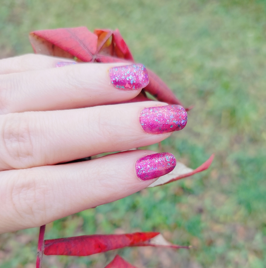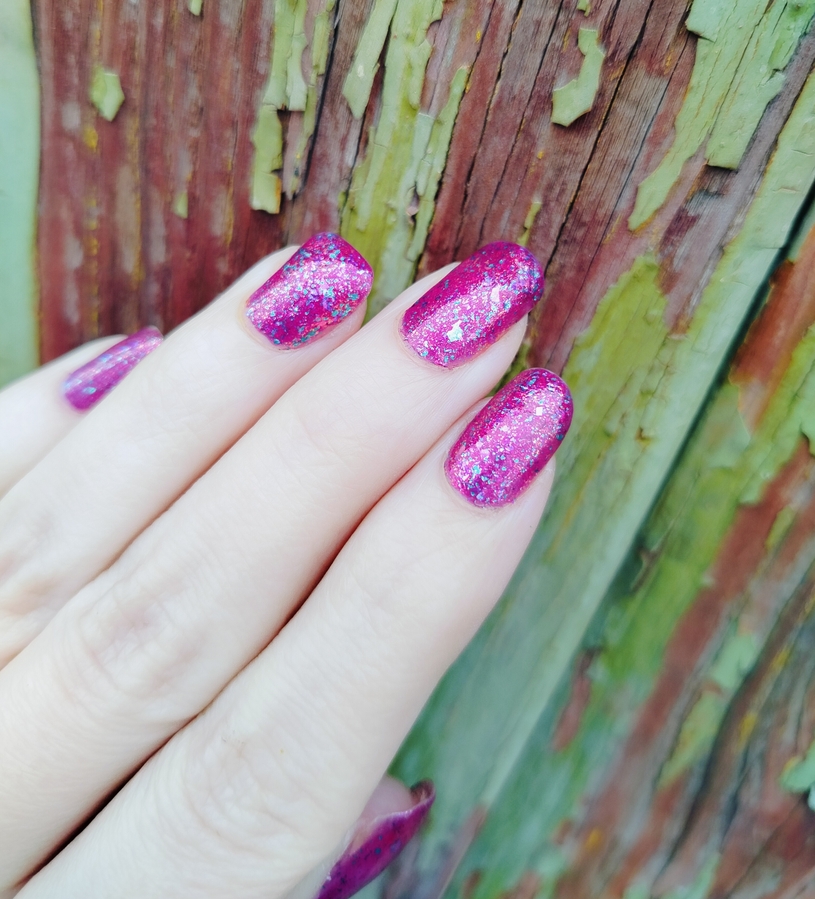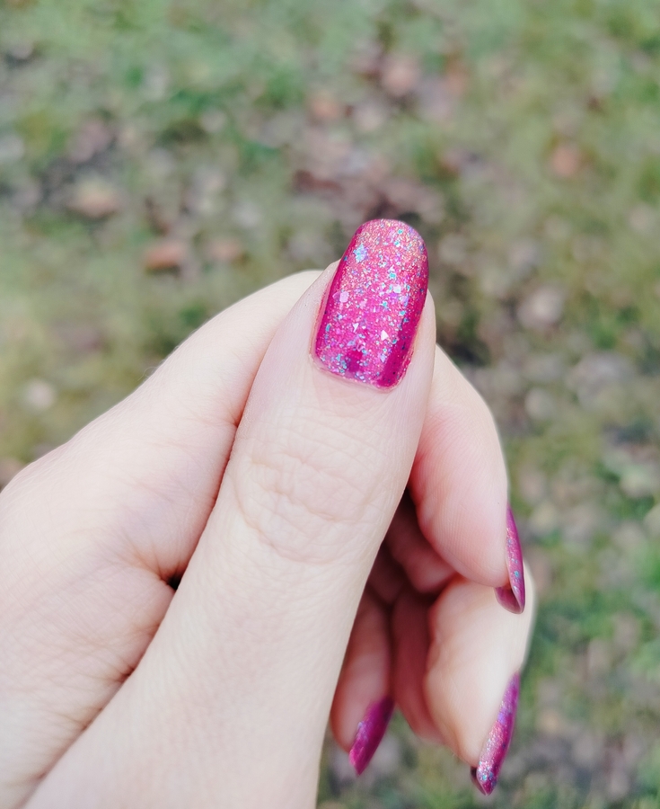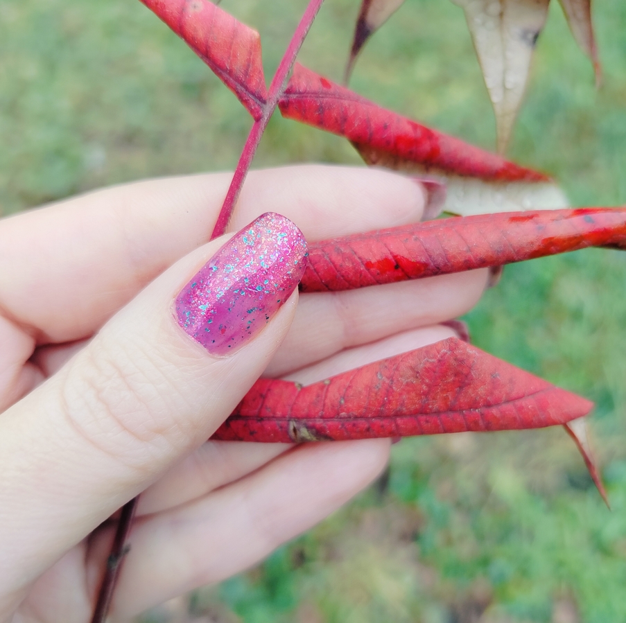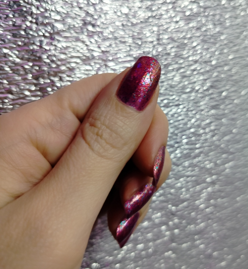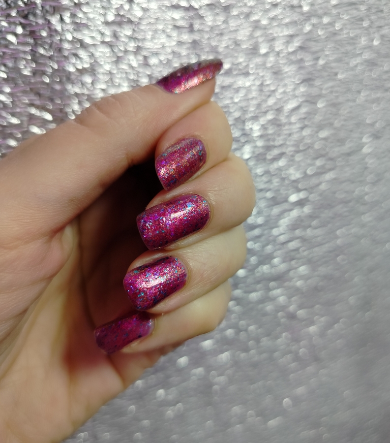 Я вижу оттенок скорее малиновым с фиолетовым подтоном, пигмент Аврора шикарно переливается в электрическом свете (солнечный, у нас к сожалению уже месяц как не включают((( Лак очень богато наполнен поталью и шиммером — бирюзовой, голубой, розовой.