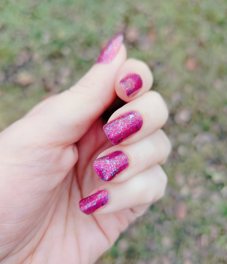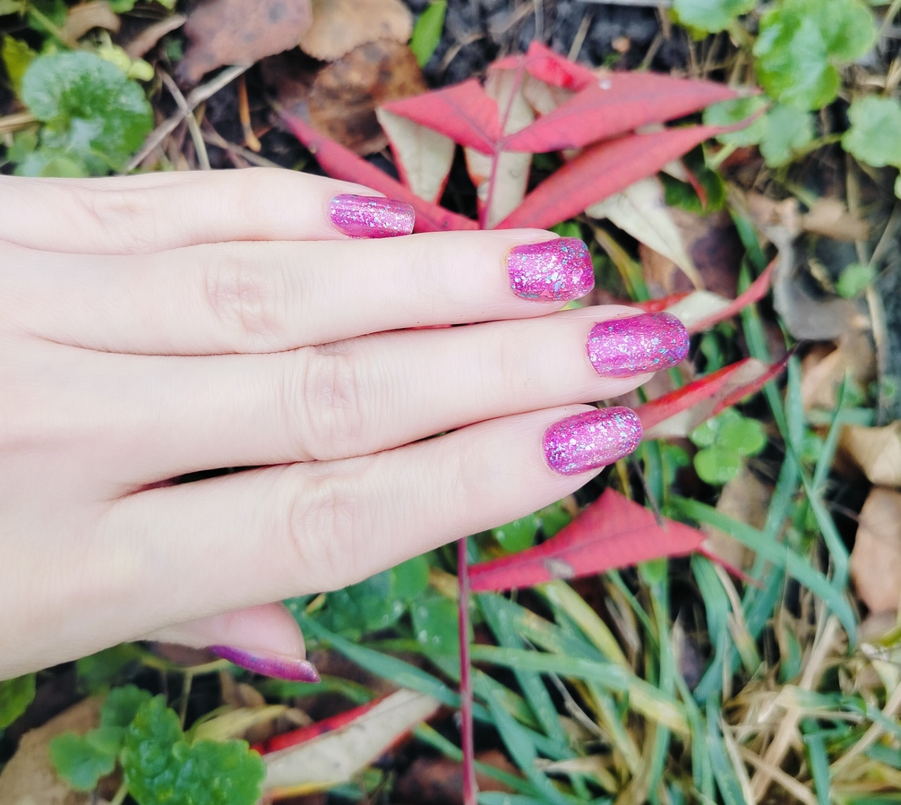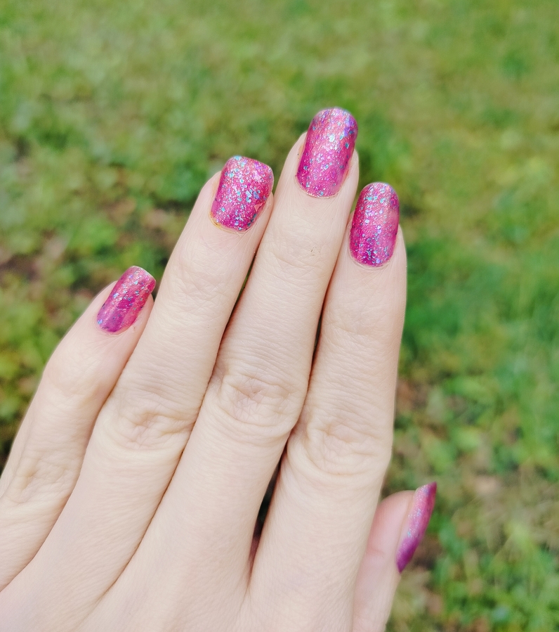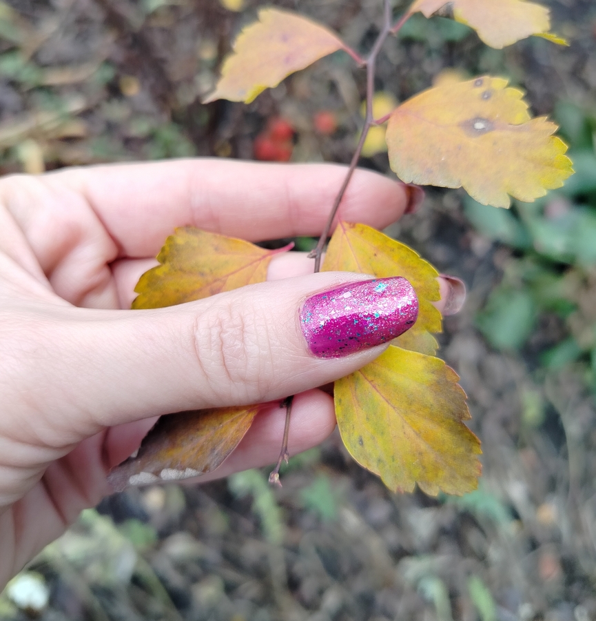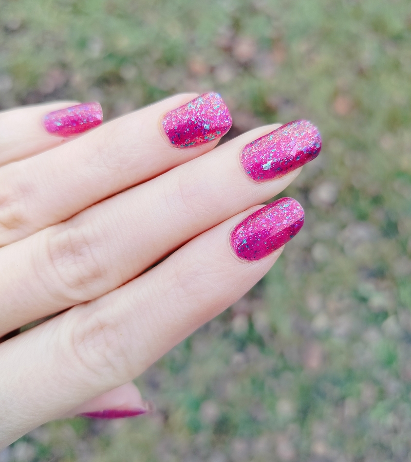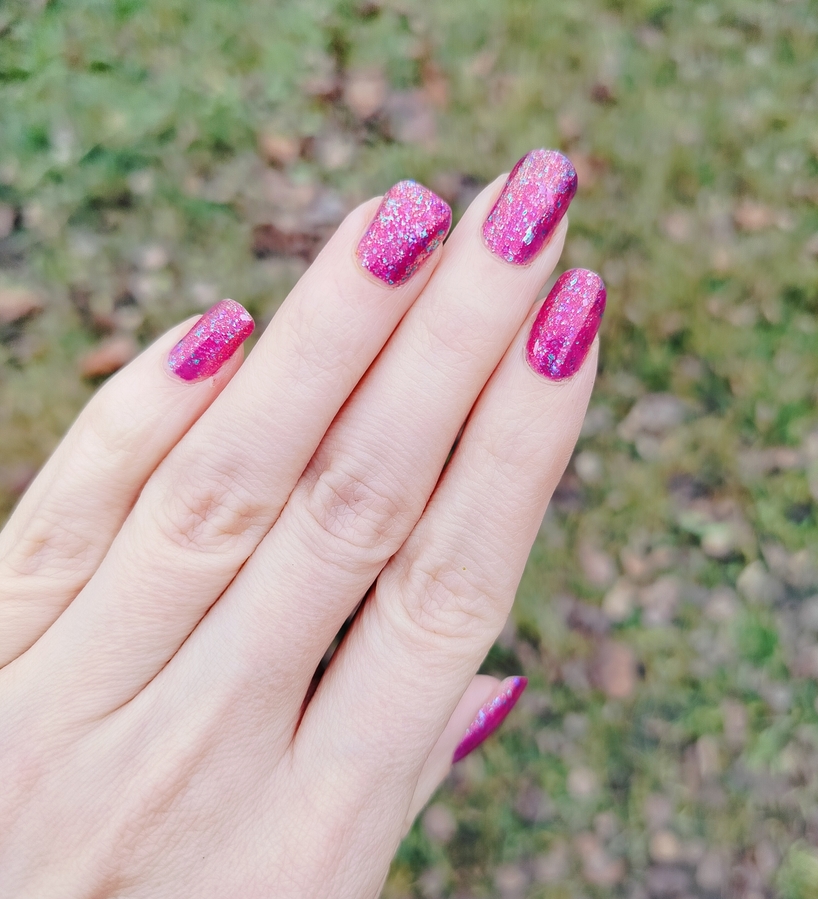 Я вижу оттенок скорее малиновым с фиолетовым подтоном, пигмент Аврора шикарно переливается в электрическом свете (солнечный, у нас к сожалению уже месяц как не включают((( Лак очень богато наполнен поталью и шиммером — бирюзовой, голубой, розовой.