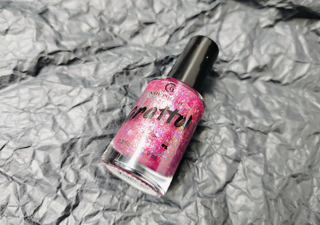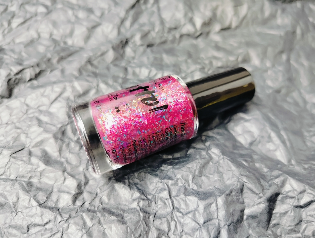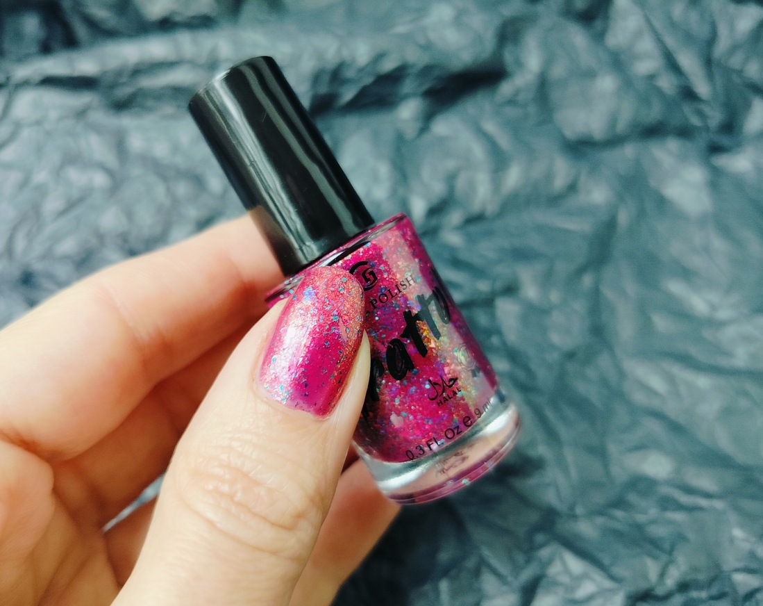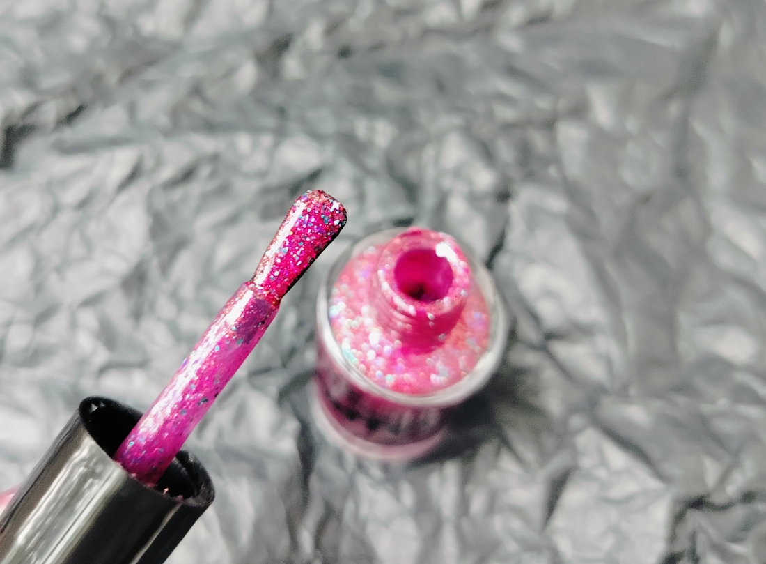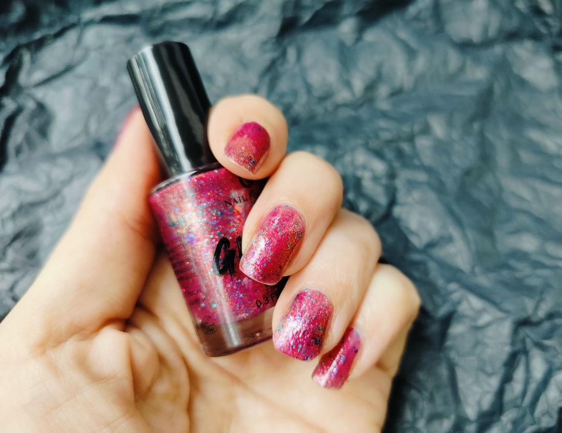 Я вижу оттенок скорее малиновым с фиолетовым подтоном, пигмент Аврора шикарно переливается в электрическом свете (солнечный, у нас к сожалению уже месяц как не включают((( Лак очень богато наполнен поталью и шиммером — бирюзовой, голубой, розовой.