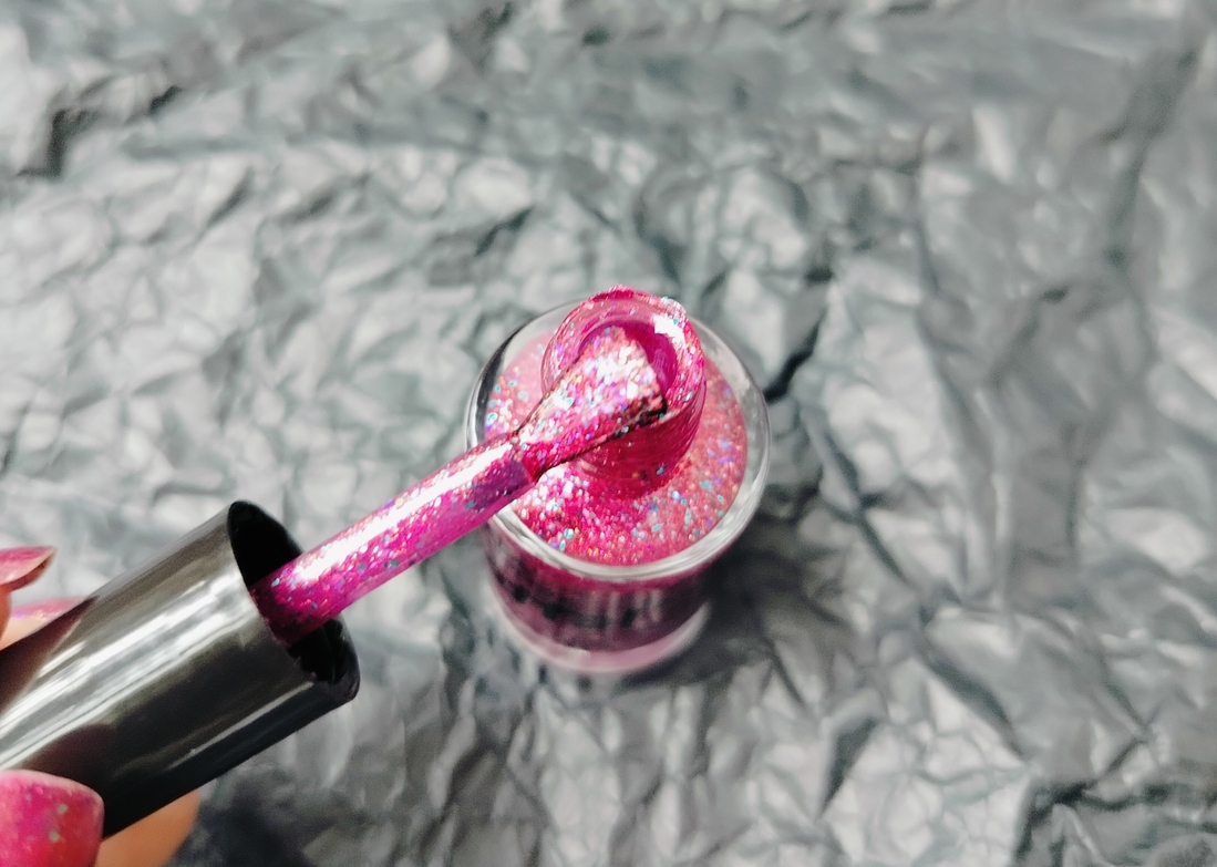 Лак немного капризен при нанесении первого слоя — если просто красить, цвет явно плешивет и стягивается при повторном прикосновении кисти. Поэтому я провожу кистью, а потом точечно добавляю лак, где недостает плотности или блесток.