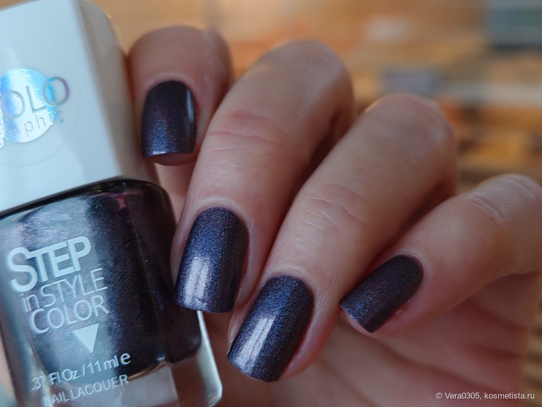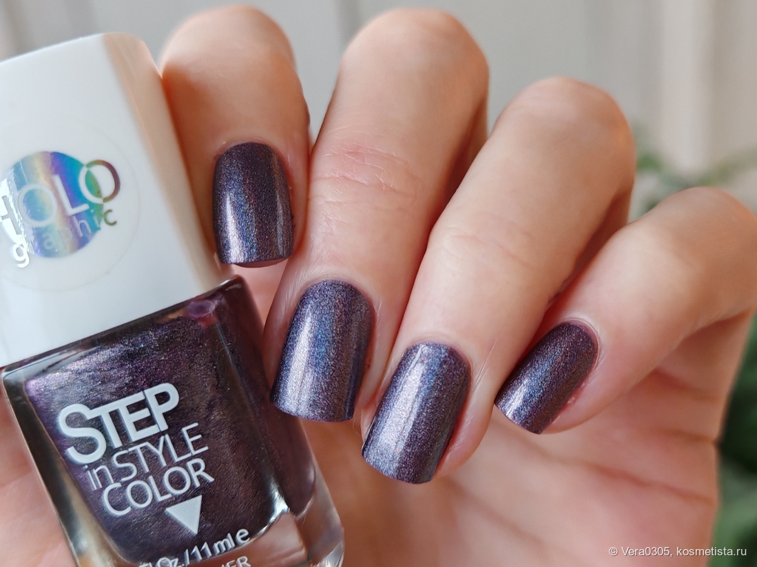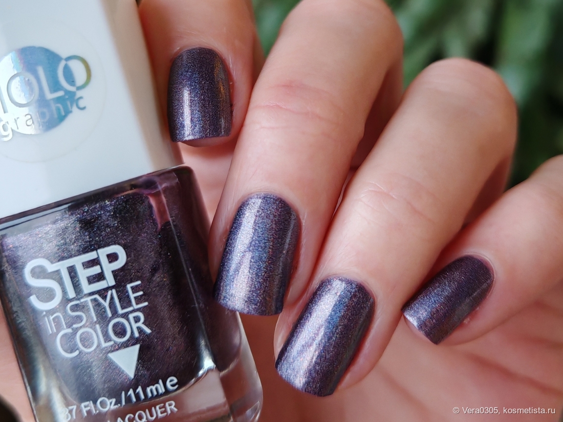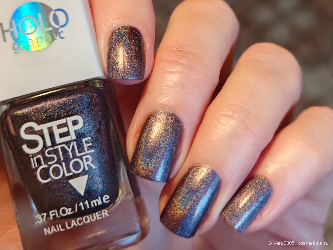 В электрическом свете ярче видна голография, но лак становится еще более стальным.