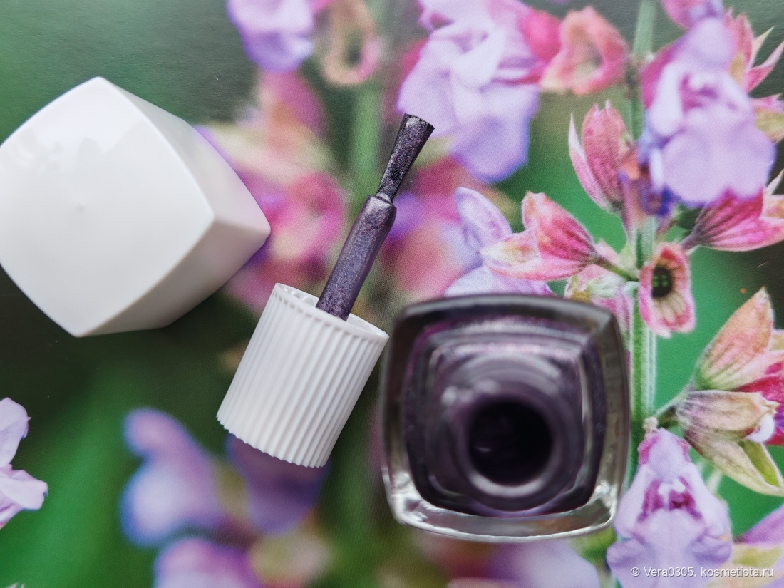 Текстура лака — шиммерная кашица. Укладывается послушно, не полосит и не размывает нижний слой.