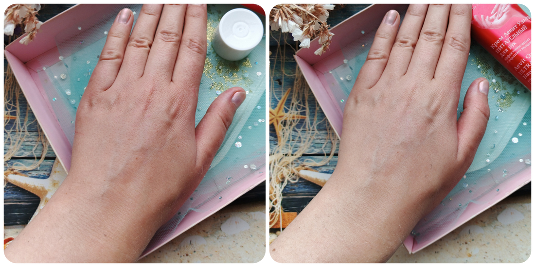 Крем быстро впитывается, не оставляет ощущения силиконовой плёнки и жирности. А также успокаивает, смягчает, обеспечивает комфорт. При регулярном использовании кожа становится более эластичной, царапинки быстрее заживают. Тактильно появляется приятная гладкость. Прологнированного эффекта нет, но пока кремом пользуешься, он работает. Единственное, что мне не нравится — отдушка и то, что средство может скатываться при наслаивании.