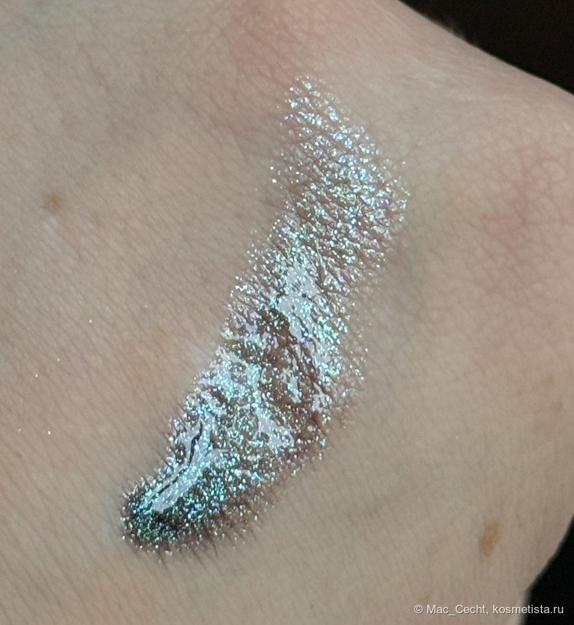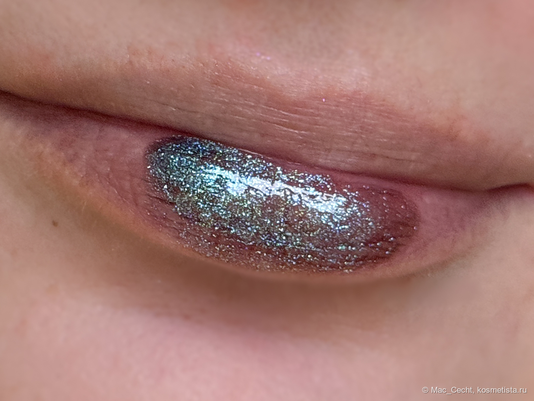 Блеск гелевый и довольно густой, так что на губах он держится долго, впитывается долго, наверное, липковат в итоге. Блестки на губах вообще остаются, пока не смоешь. Не в полном составе, конечно, но прилично, особенно по контуру.