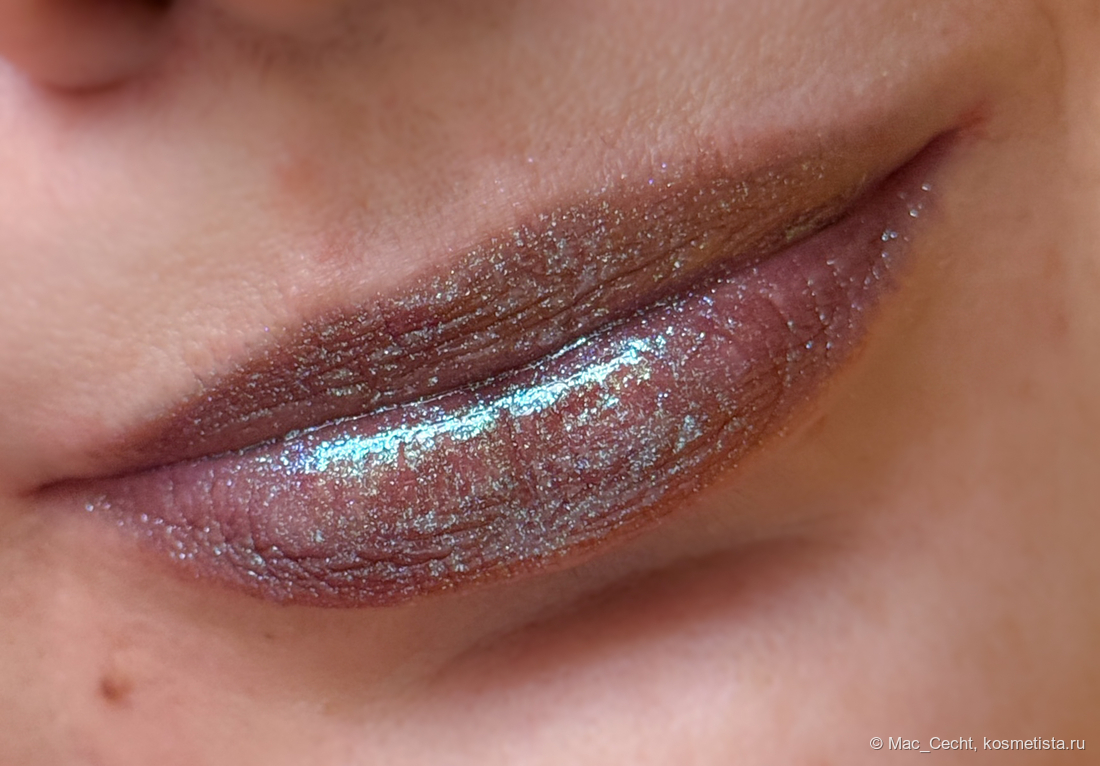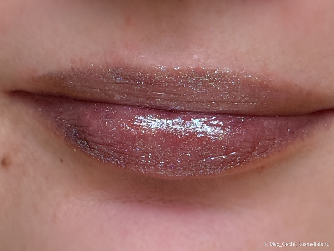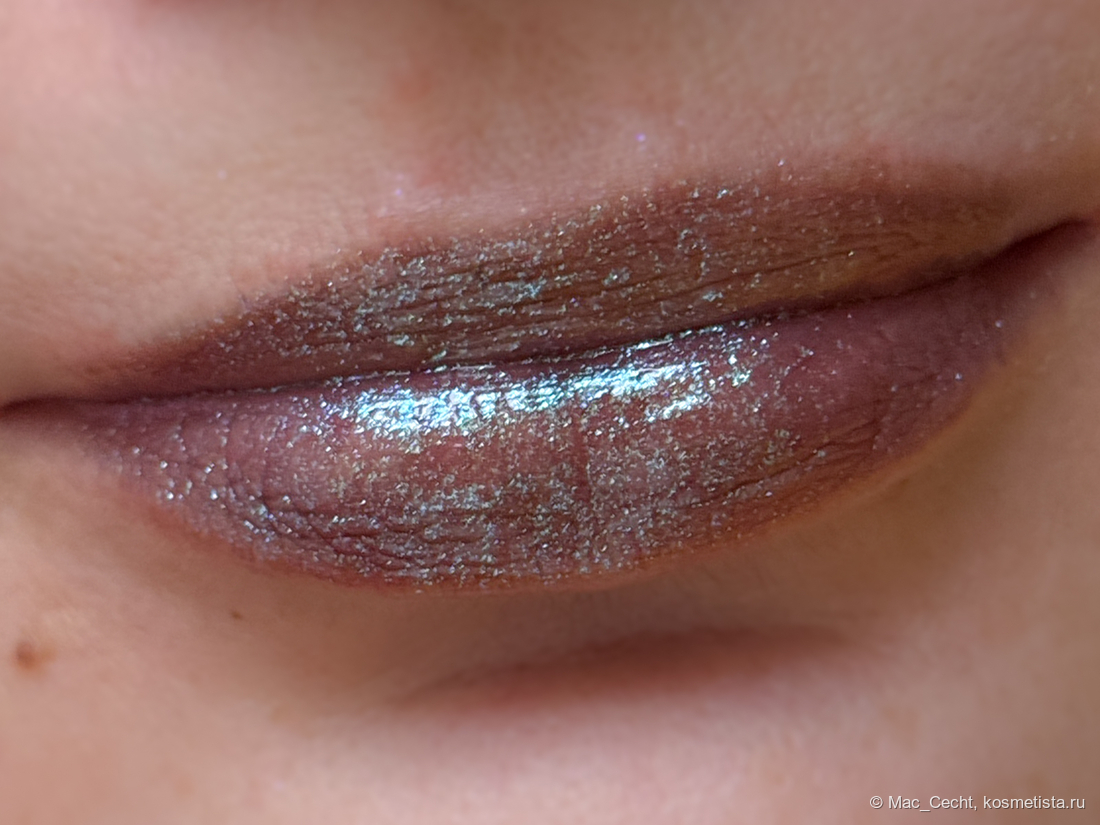 На фото обнаружила, что по контуру губ блеск лежит темнее, но в реальности я этого не замечала. В реальности и блестки акцентнее и заметнее, за ними базы и не видно.