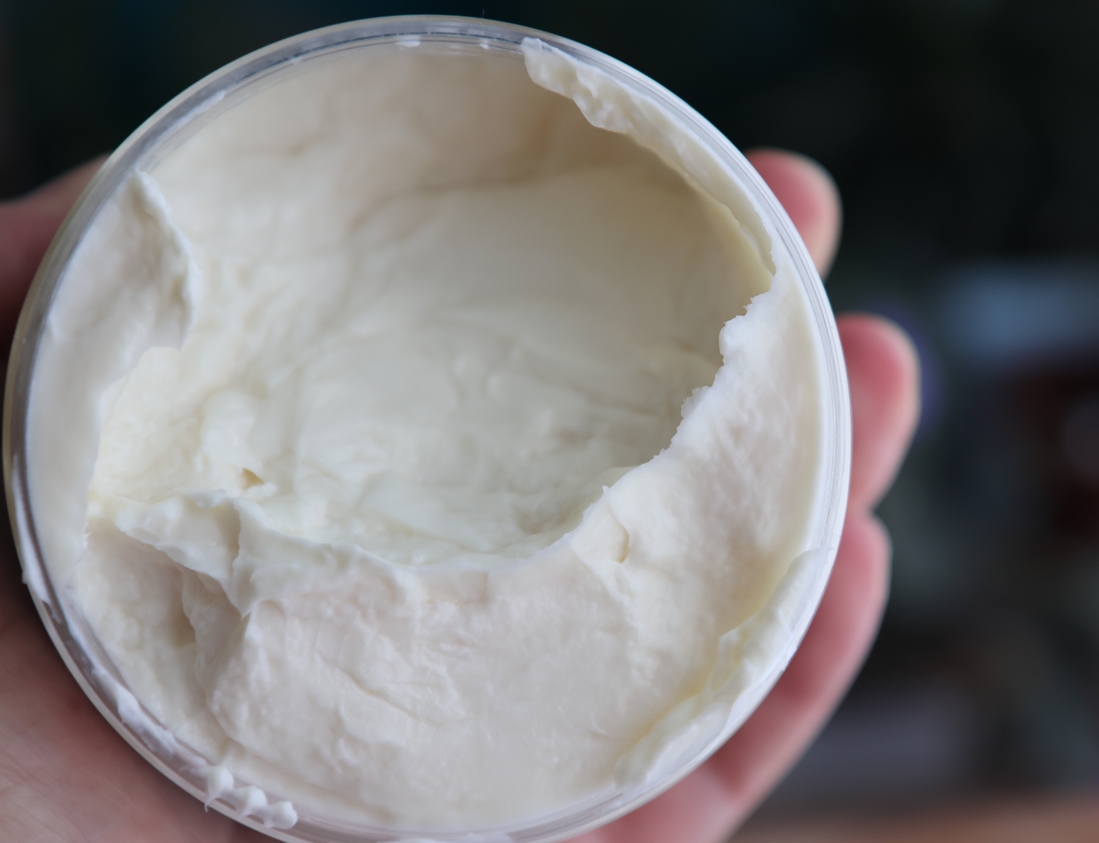 В банке-шайбе с заглушкой и закручивающейся крышкой плотный крем. По текстуре похож немного на взбитое масло из детства, когда к празднику готовили Наполеон.