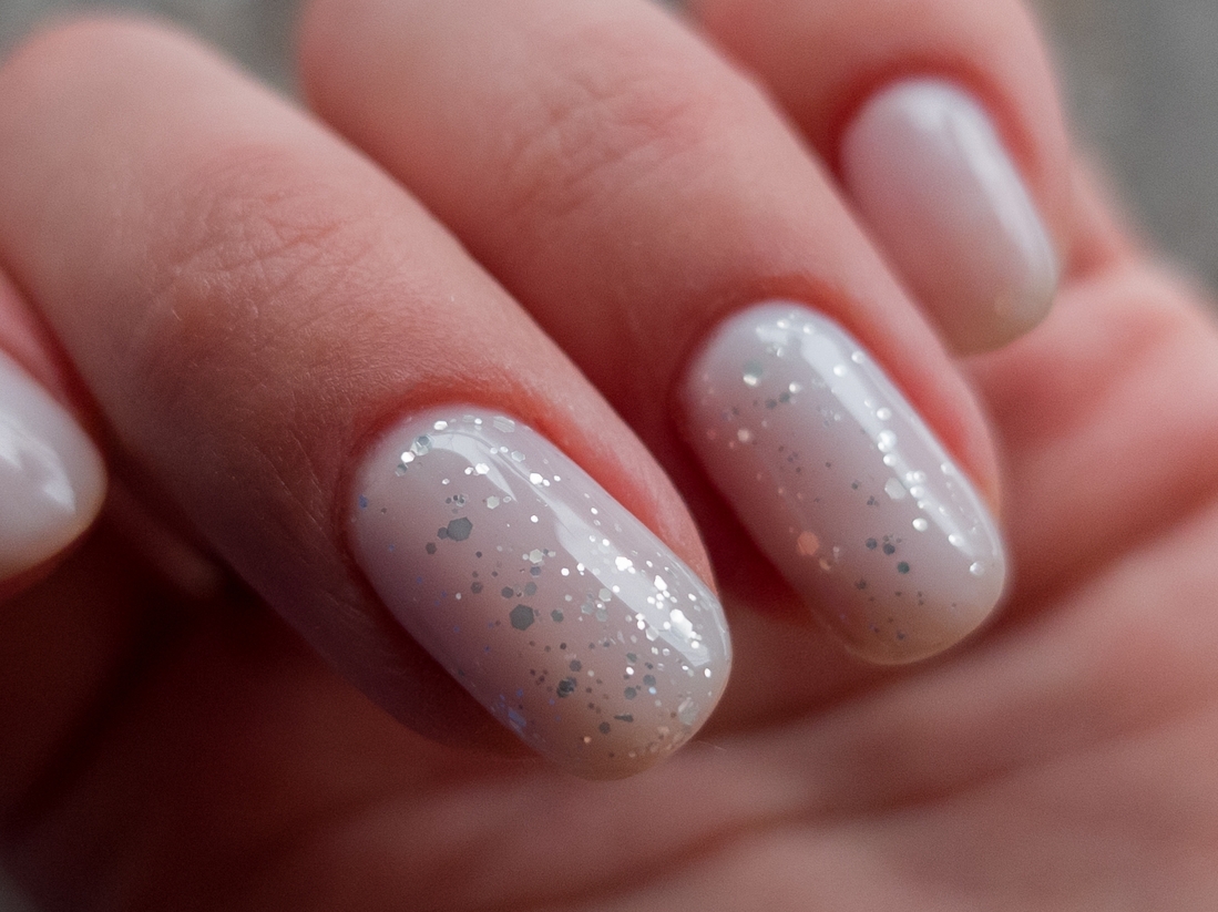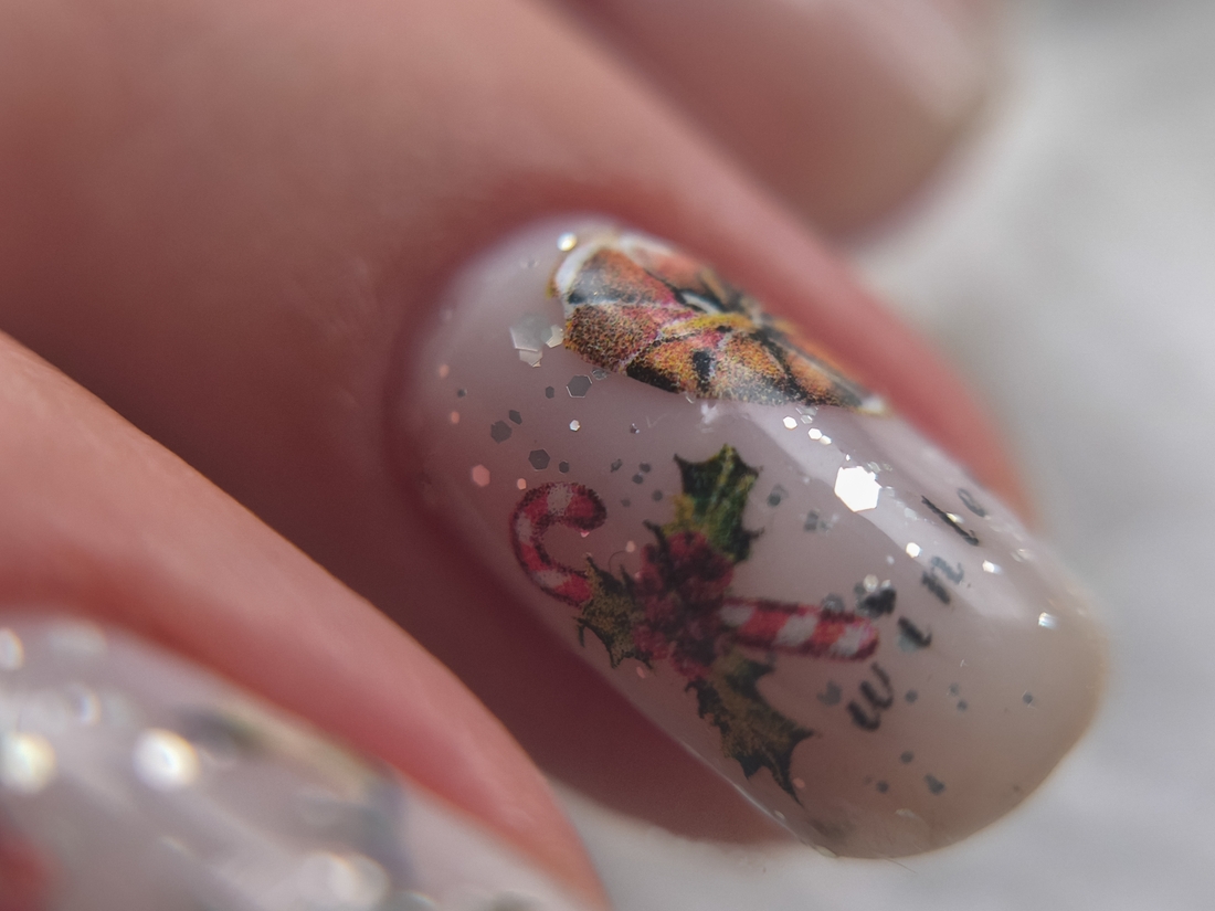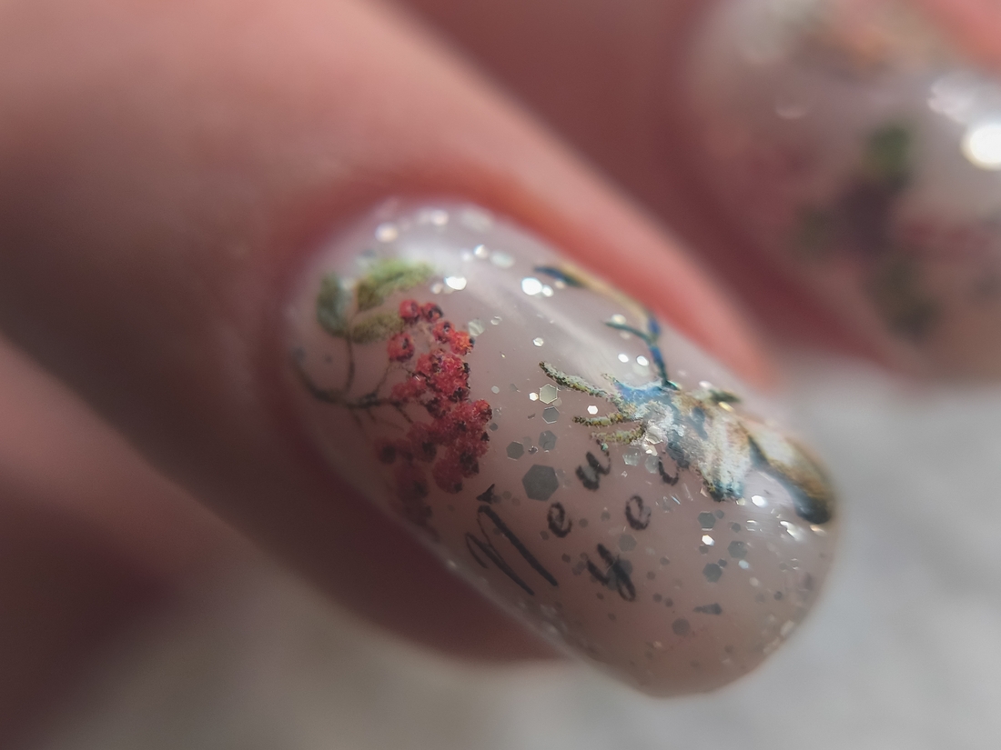 Совсем без блесточек не получилось 😄, я подумала добавить немного серебристого шиммера, который напоминает мне снежок. Нанесу его только на средний и безымянный палец и липкий слой не снимаю, на него я буду устанавливать слайдеры. Если липкости на ногтях не будет, они не приклеются.