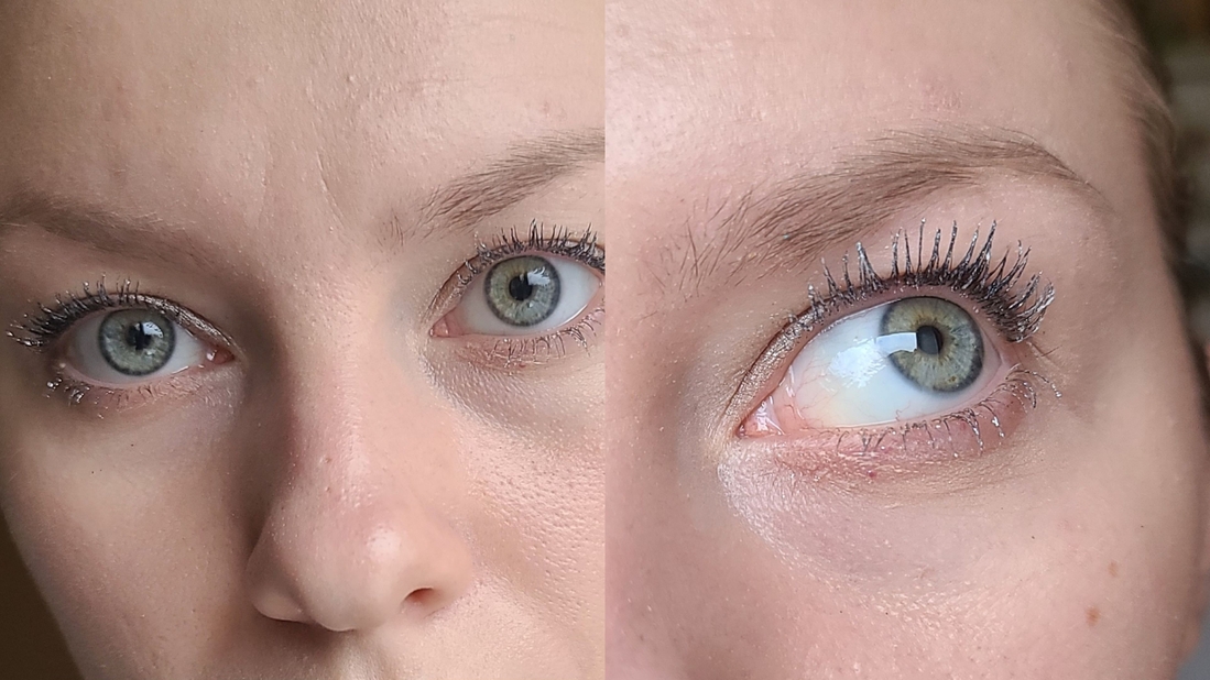 Как и советовали в отзывах, я наношу её поверх обычной чёрной туши, пока та ещё не высохла — так лучше сцепка.