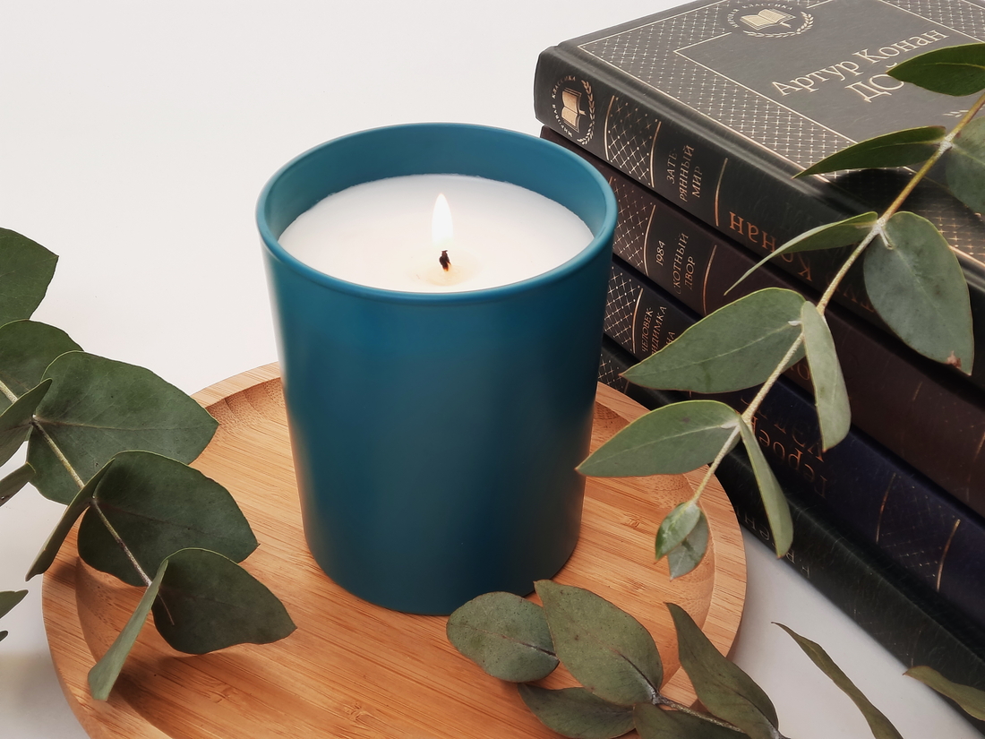 Сама свеча находится в стеклянном стакане — прозрачном, аккуратном, с минималистичным дизайном. Выглядит очень красиво и универсально, легко вписывается в любой интерьер: на рабочем столе, прикроватной тумбе, в гостиной или ванной. Стекло придаёт свече ощущение чистоты и лёгкости, а цвет воска смотрится спокойно и благородно. Когда свеча зажжена, пламя мягко отражается в стекле и создаёт уютное, тёплое свечение без резкого света.