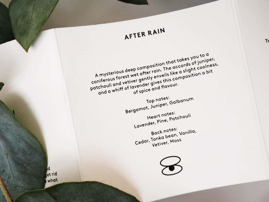 По мере раскрытия проявляются более глубокие ноты — лаванда, пачули, сосна, которые добавляют спокойствия и баланса, но при этом не усыпляют, а наоборот помогают сосредоточиться. Для работы, чтения, утренних ритуалов или когда нужно «прийти в тонус» - это просто идеальный вариант. В базе чувствуются кедр, мох, ветивер. Аромат становится более плотным, уютным, но всё равно остаётся свежим и чистым.
