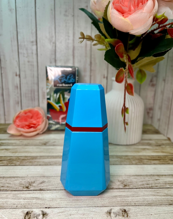 Стеклянный флакон, покрытый бирюзовой эмалью с бордовым пластиковым пульверизатором и ободком, имеет необычную трапециевидную форму с выраженными гранями. Выглядит олдскульно, в духе 80-х, и его устаревший вид (в хорошем смысле) меня полностью устраивает и привлекает. Тандем бирюзовых и бордовых тонов создаёт магнетический, самобытный контраст.