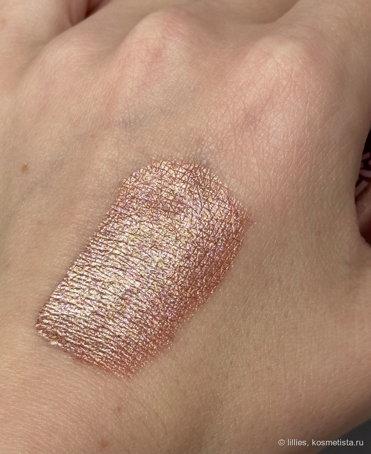 Действительно персиковый, не оранжевый, с разноветным шиммером, который на глазах не ощущается. И что мне очень нравится — в нем нет того металлического эффекта, который был в Luxvisage и который знатно жевал мои и без того рельефные веки.