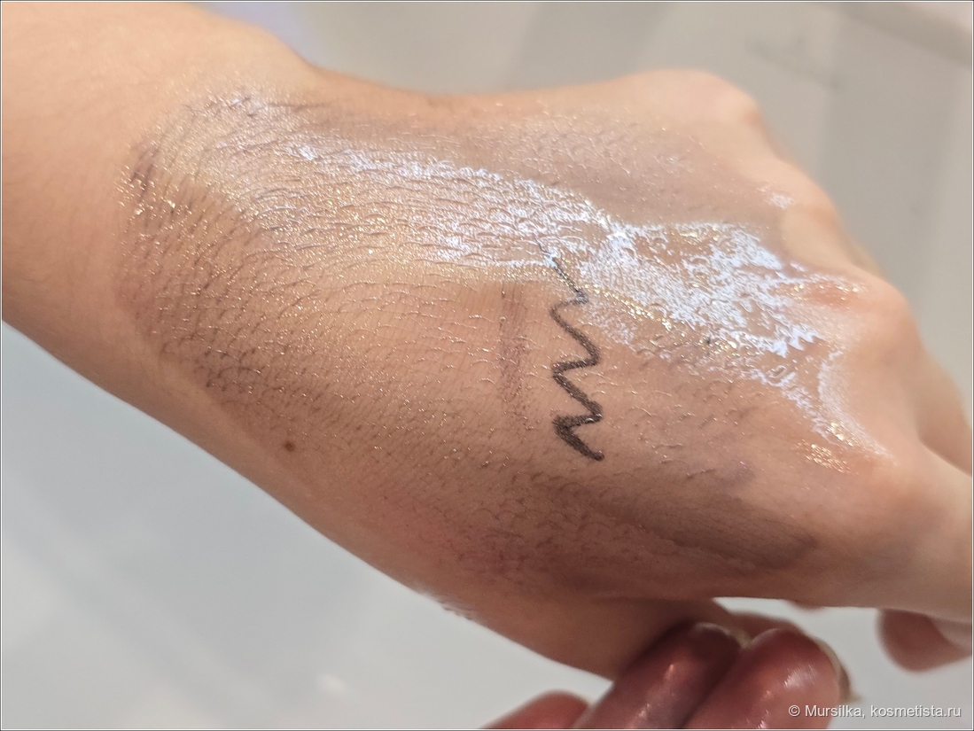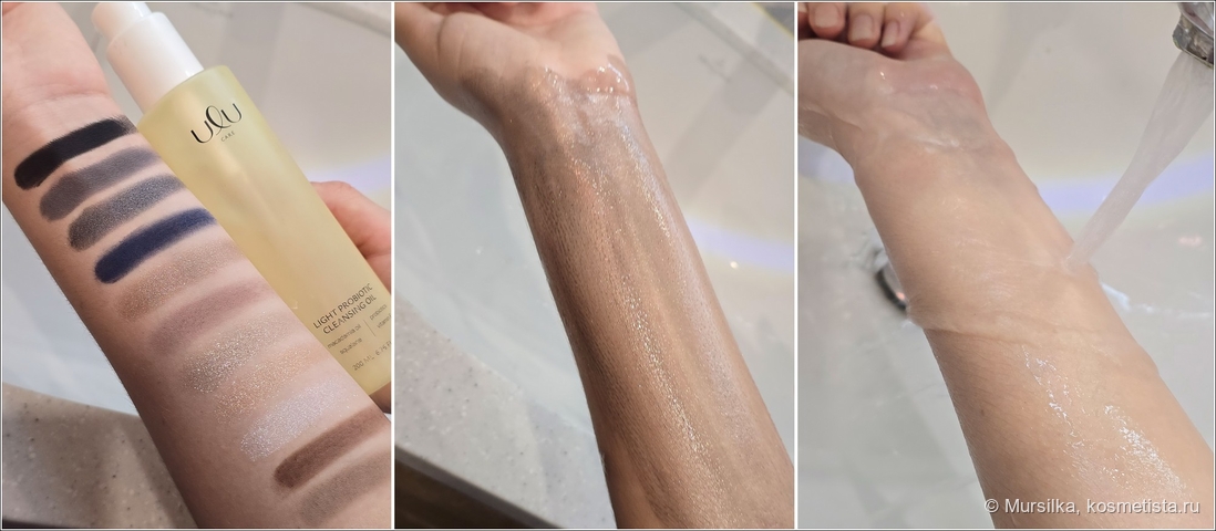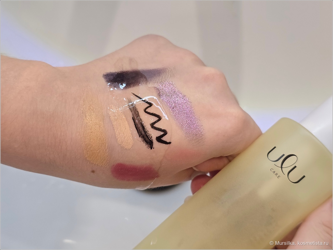 Масло превосходно справляется с большинством видов косметики. Свотчи теней смываются играючи.