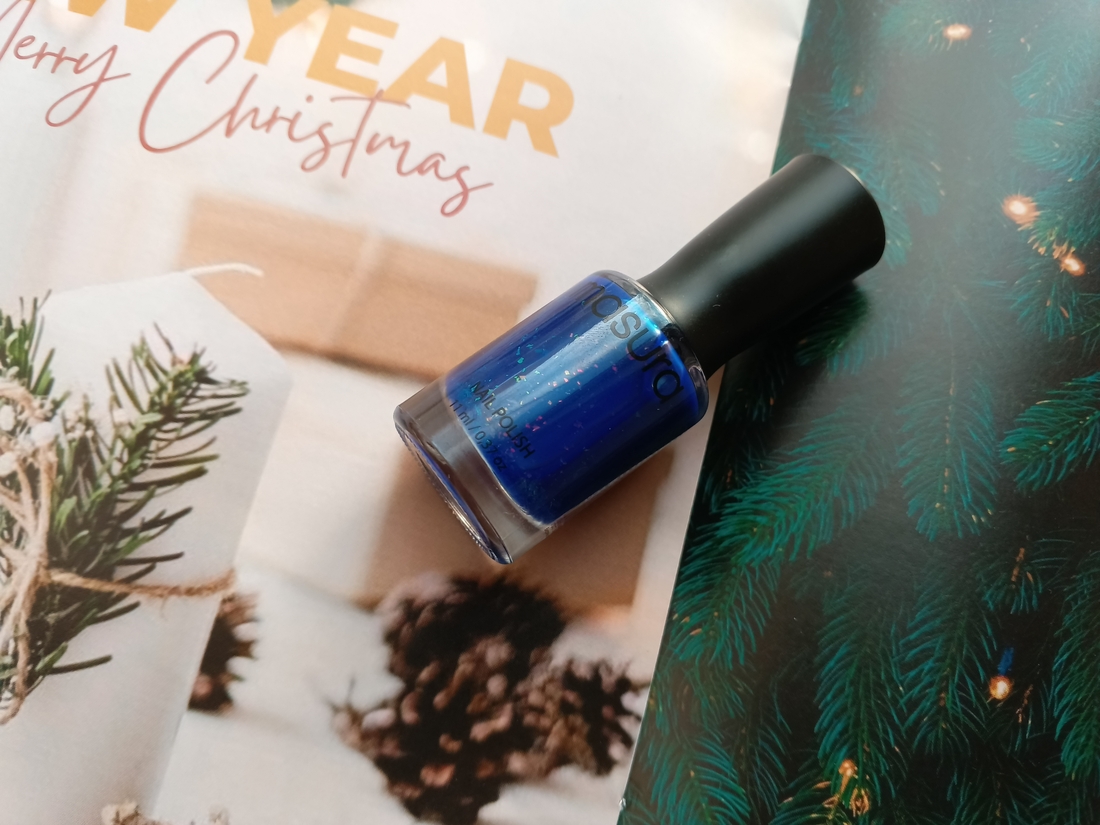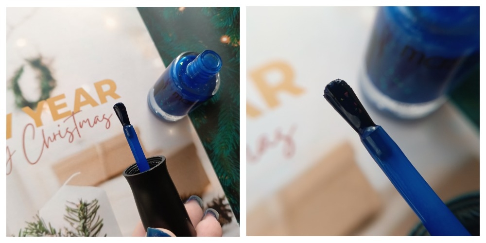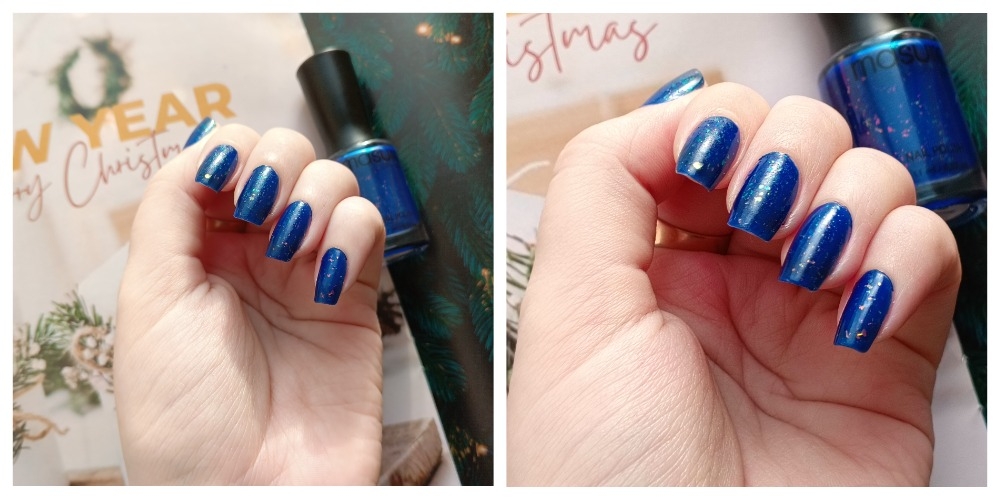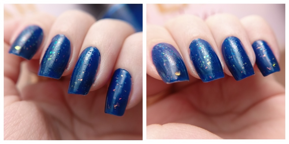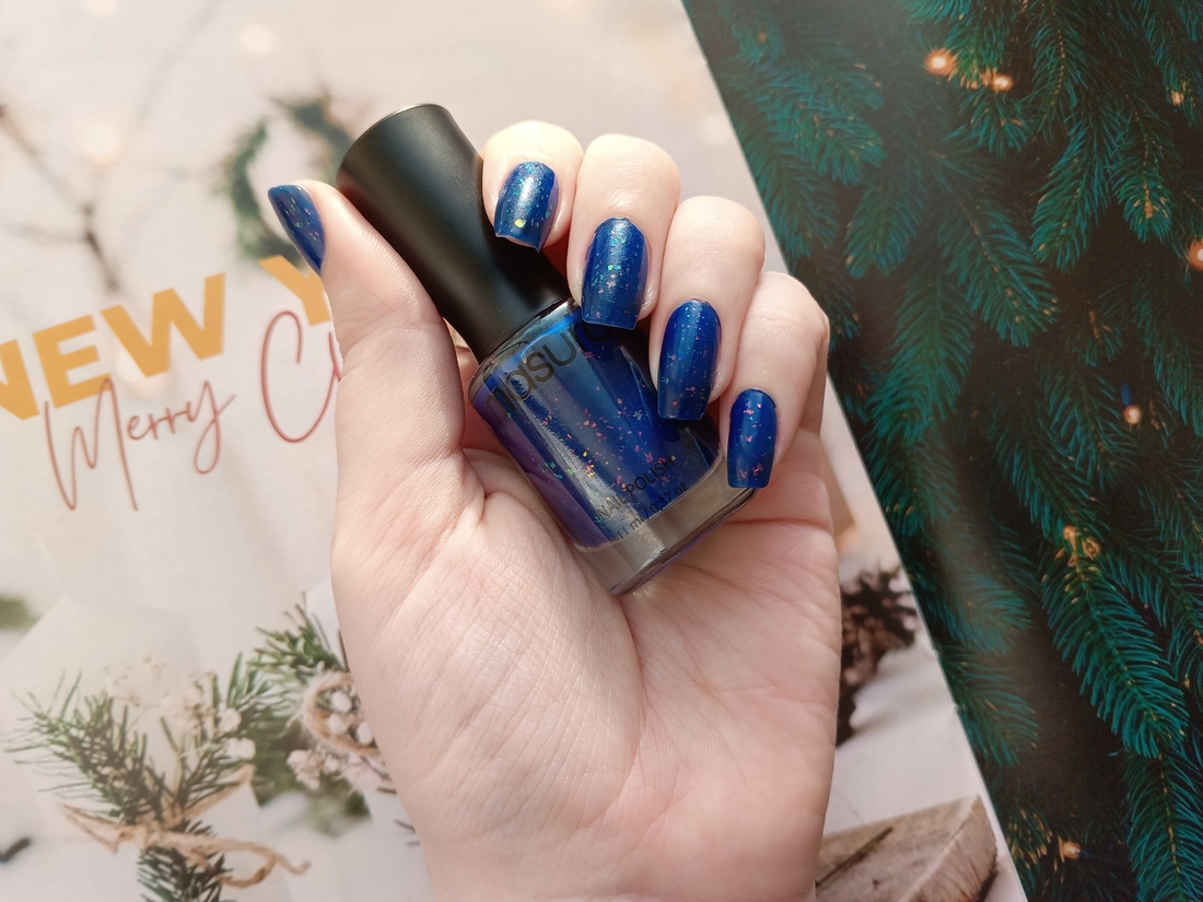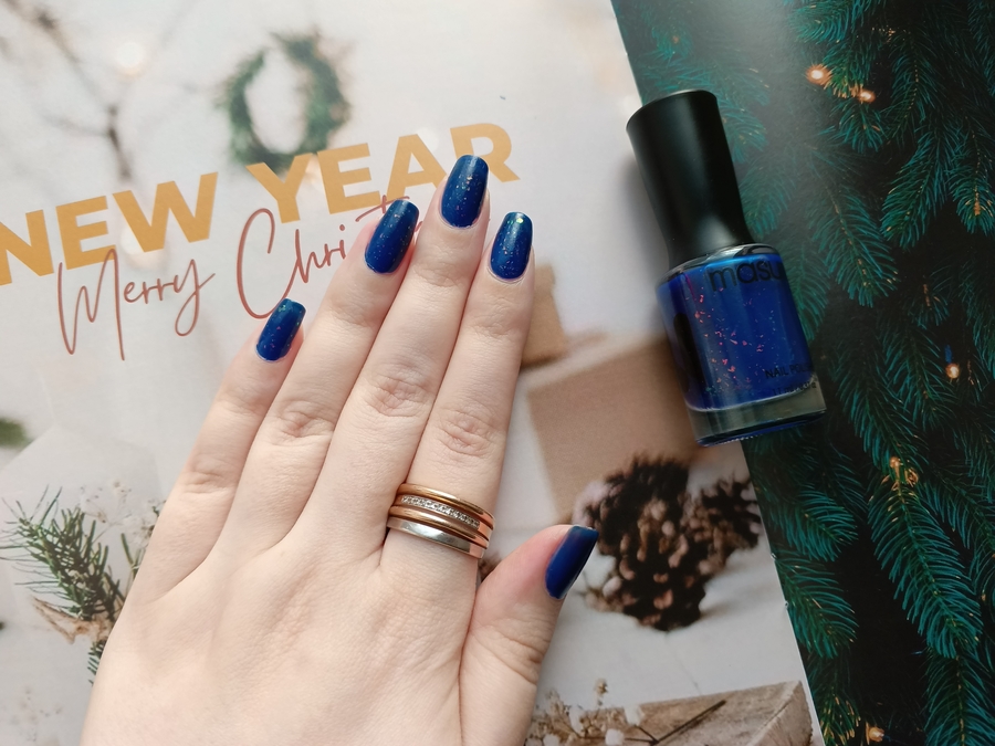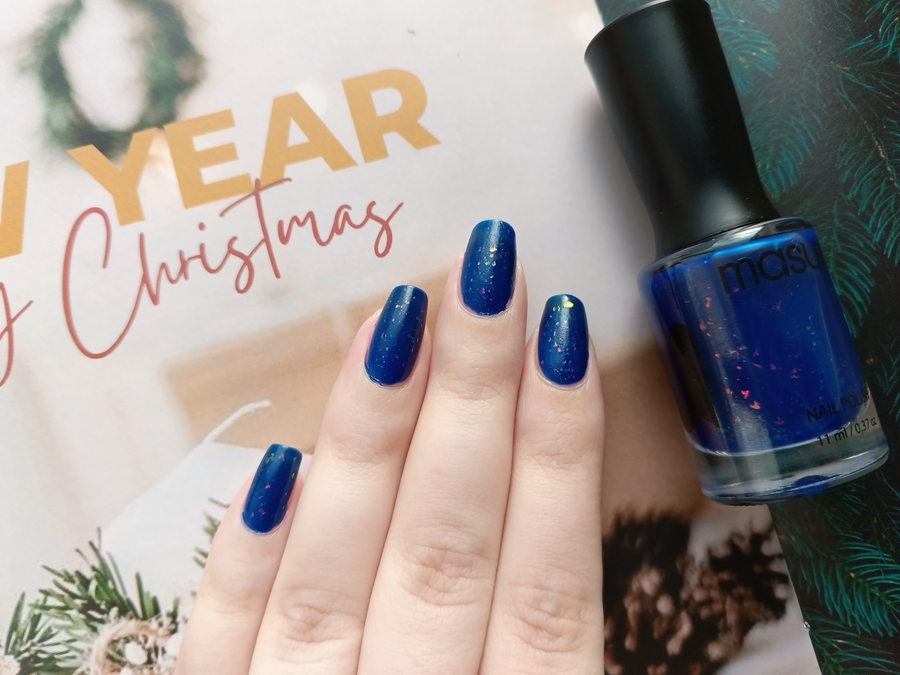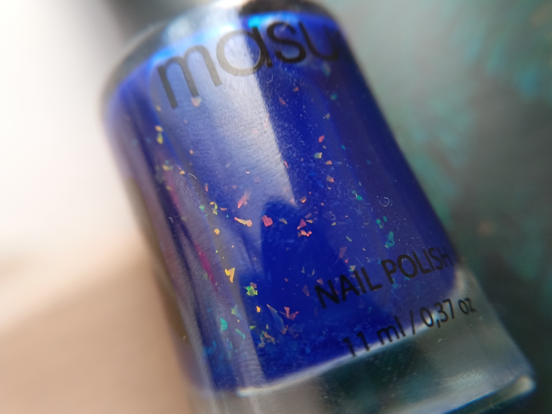 Оттенок насыщенный синий с мультихромной слюдой, слюда средняя по размеру, очень яркая, горящая. Но именно в этом оттенке почему-то сползает на дно флакона. И его приходится усиленно трясти перед использованием. А у Masura внутри нет металлических шариков, так что перемешать равномерно не всегда получается.