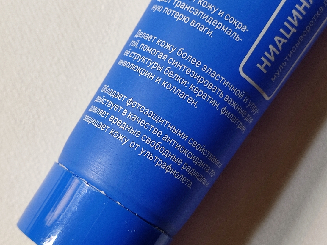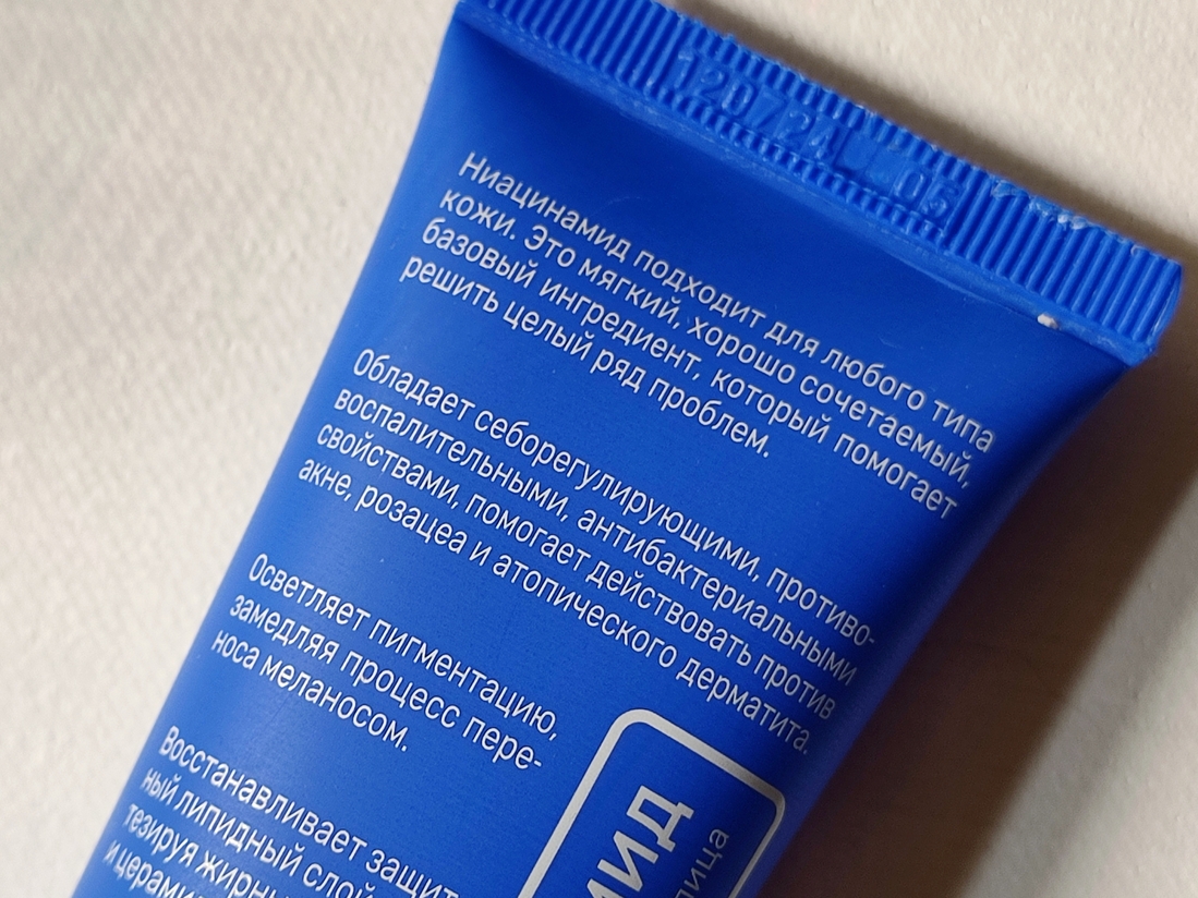 Упаковка. У меня старая версия. Туба из достаточно жёсткого пластика. Срок годности на спайке. Вся информация указана на стенках. Достаточно удобно. Но инфомацию о концетрации ниацинамида я не нашла. Хоть и брала 5%. Может на новых упаковках это исправили. Состав с сайта продублировала под значком колбочки внизу поста, если вдруг на фото он плохо читаем.