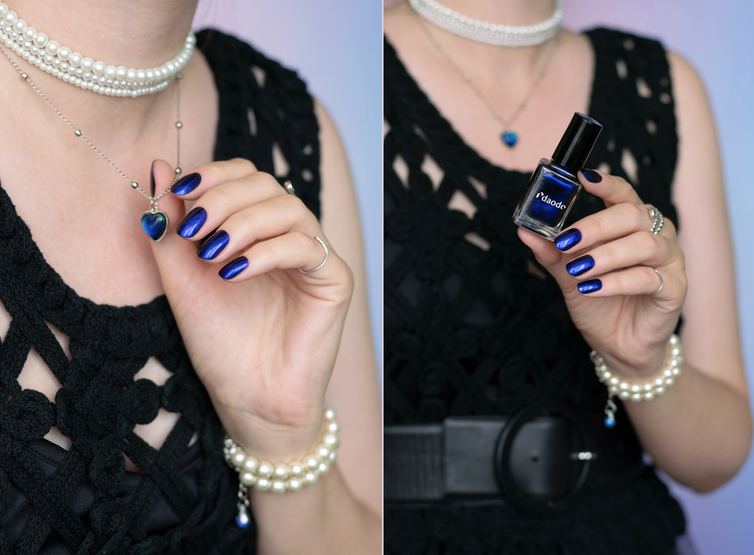 Синий цвет – один из моих нелюбимых) И в одежде, и в маникюре. Но иногда встречаются такие красивые лаки, что эта нелюбовь трещит по швам)) Среди таких, например, – «Глубокий океан» Daodo.