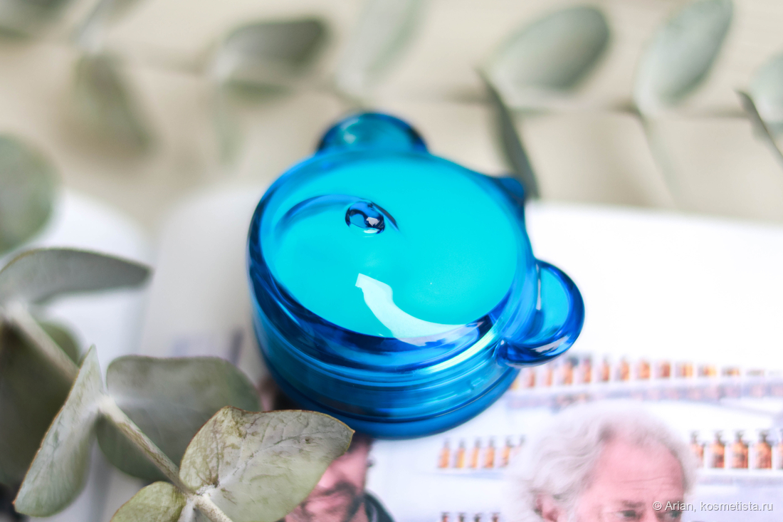 Упаковка: очень интересная полупрозрачная синяя баночка с крышкой в виде схематичной медвежьей мордочки. Закрывается надёжно, лопатки не имеет (стоит завести свою). Больших минусов в ней не вижу.