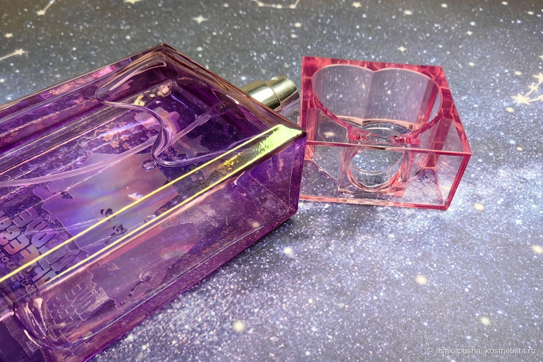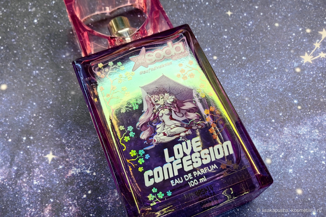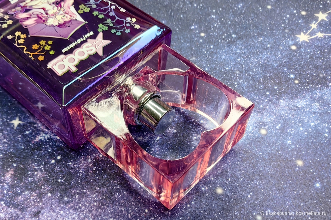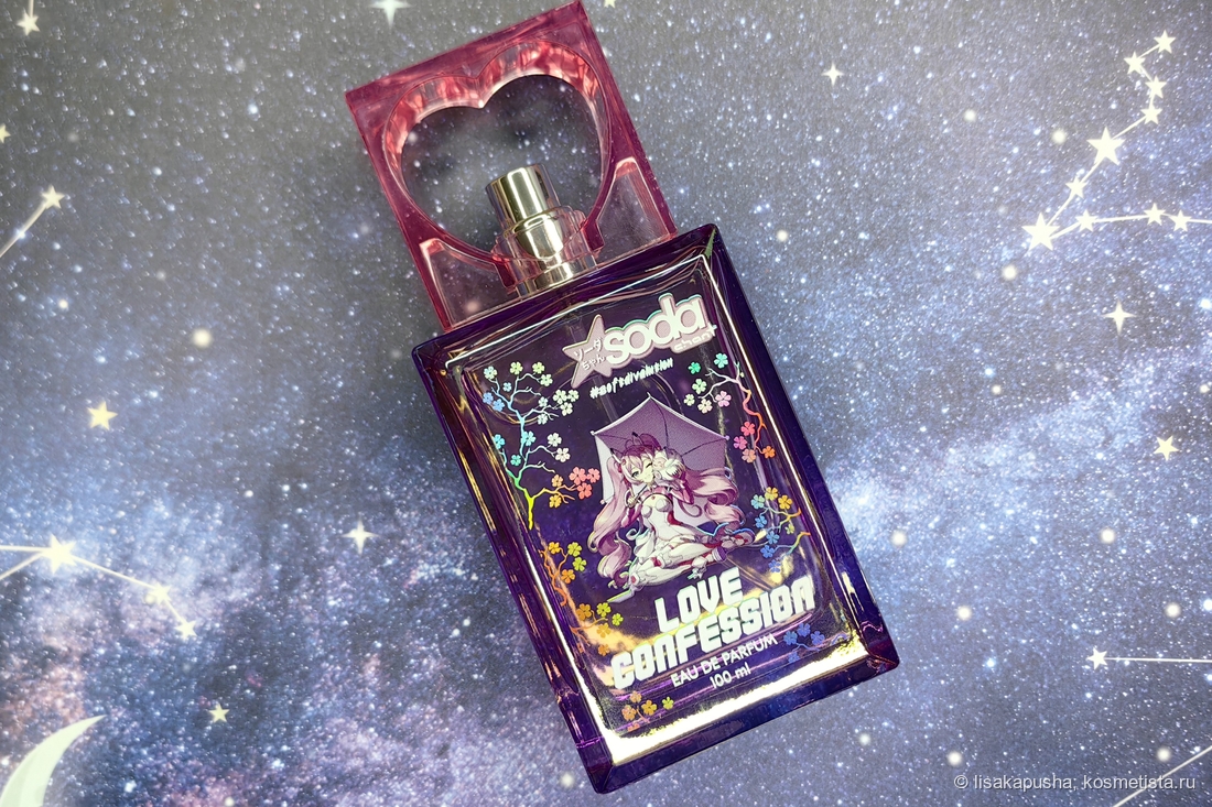 Парфюмерная вода от Соды покорила меня в первую очередь оформлением. По истине девчачий формат, который будет ярким акцентом на туалетном столике. Корпус флакона полностью выполнен из окрашенного прозрачного стекла. Крышка выполнена с использованием символа «сердце». Она, конечно, мало функциональная, но очень милая.