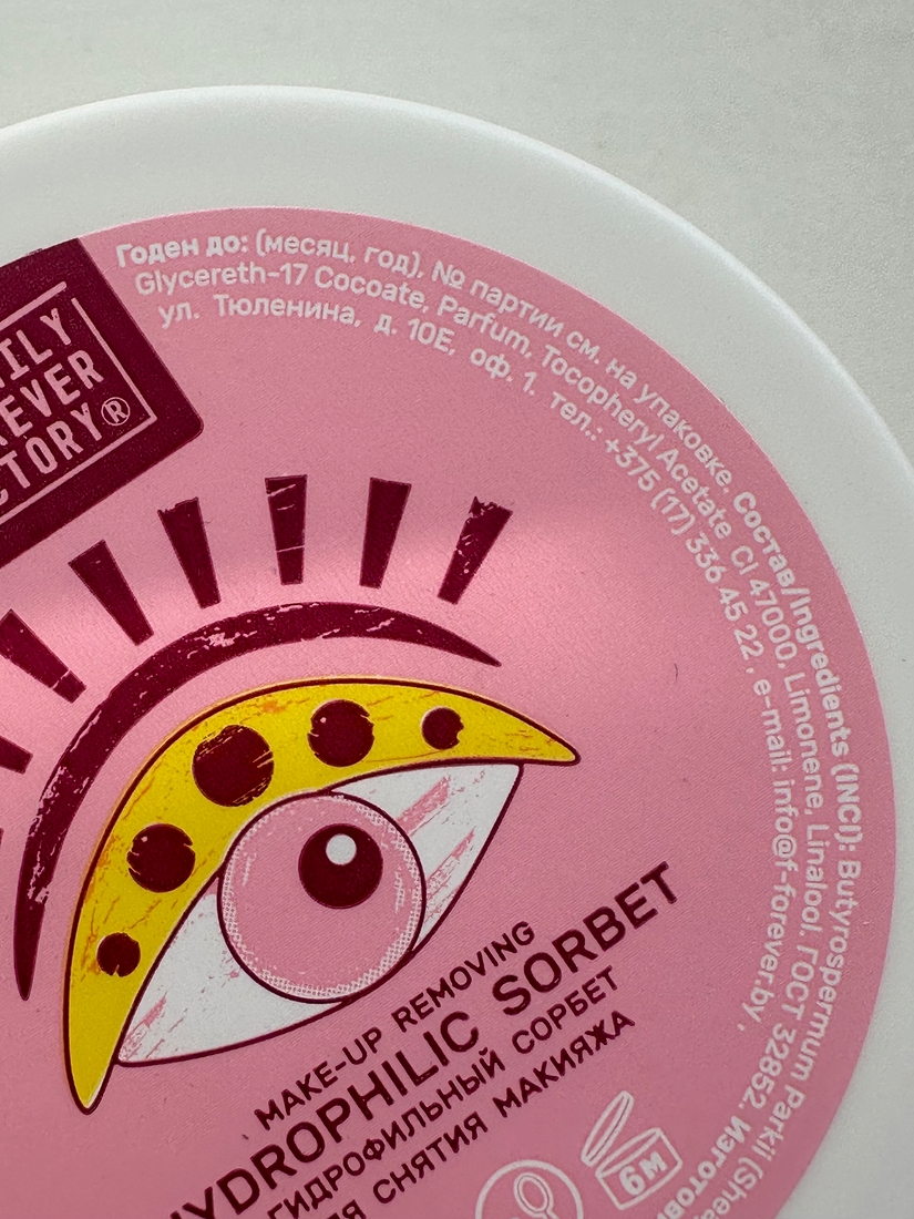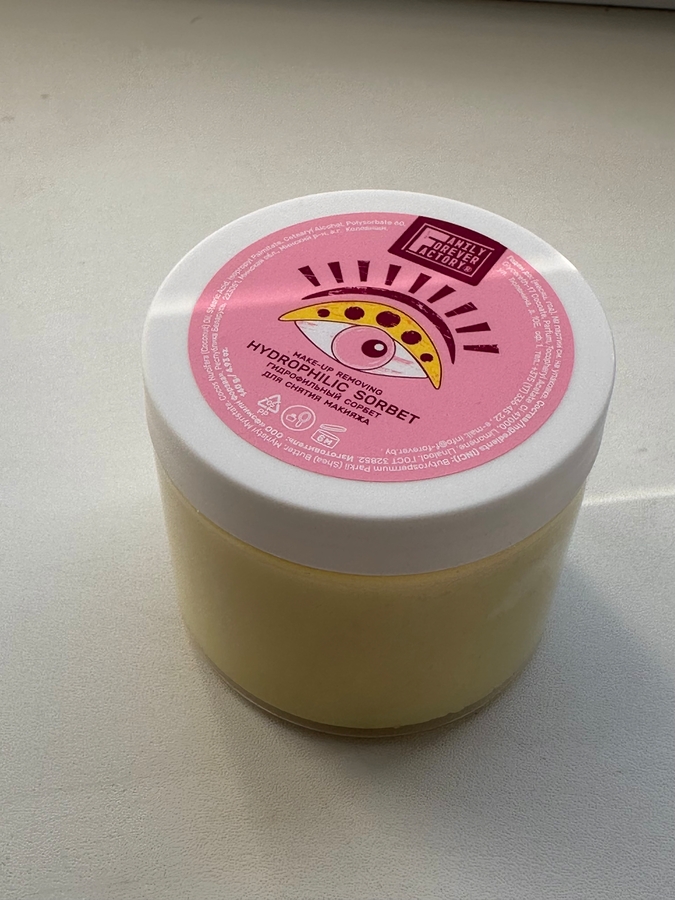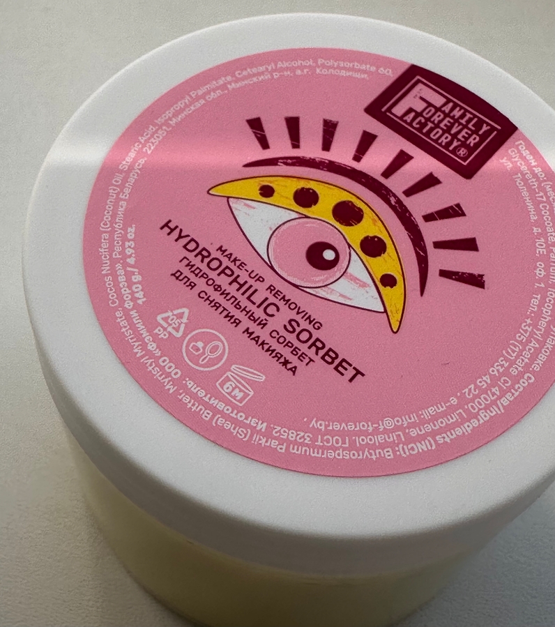 Гидрофильный сорбет от Family forever factory идёт в комплекте со специальной лопаткой, которой можно удобно набрать бальзам из баночки. Но и без неё он прекрасно добывается, так что ею я не пользовалась и почти сразу избавилась. Изначально была ещё картонная коробка со всей необходимой информацией.