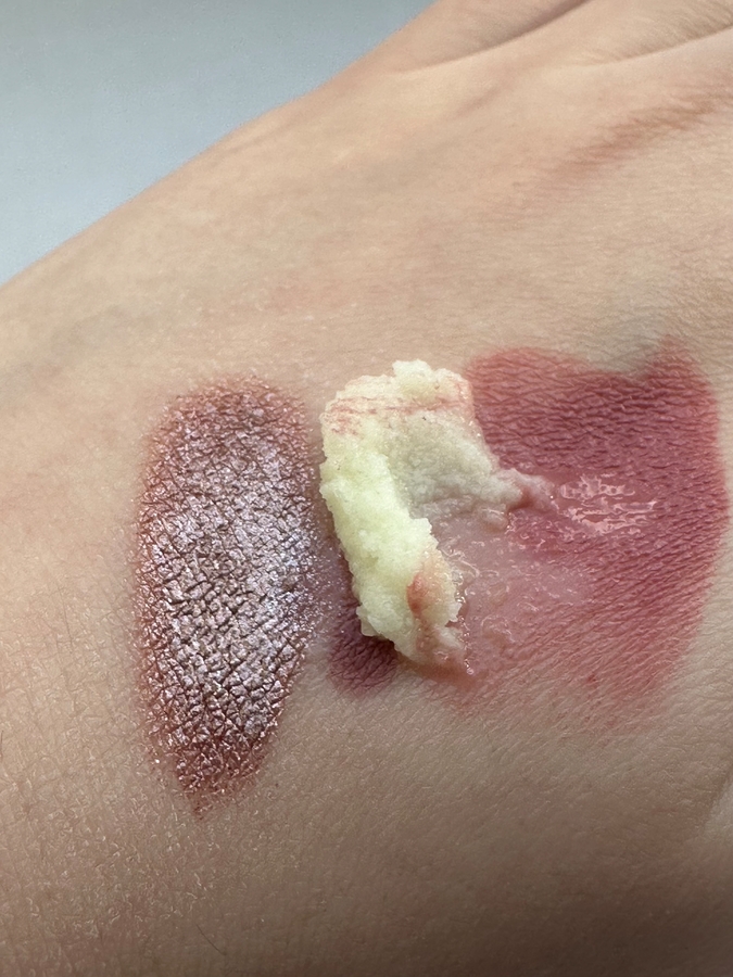 Покажу наглядно очищающие свойства на примере средних по стойкости сияющих теней, кремовых румян и особо устойчивого карандаша для губ: