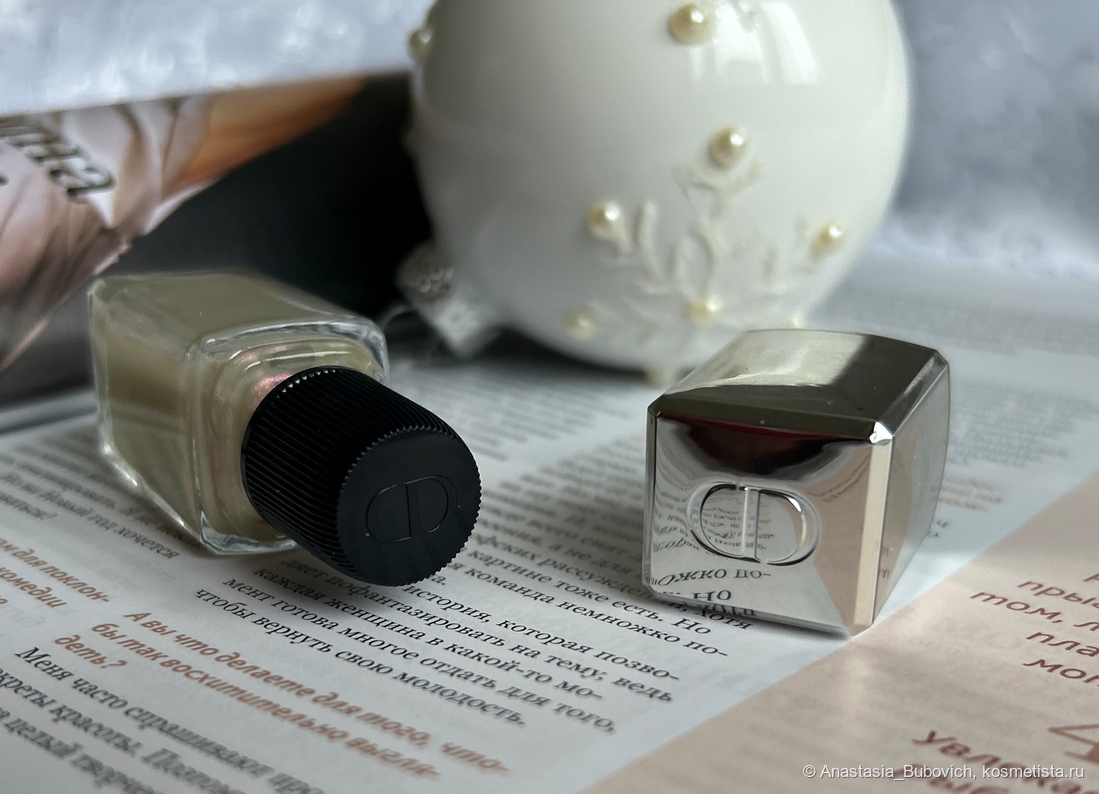 Так как этот лак входил в коллекцию 2022 года, оформление у него старое. Тёмно-синяя глянцевая картонная упаковка, внутри которой находится увесистый стеклянный флакон с серебристой зеркальной крышкой и логотипом CD на ее верхушке.