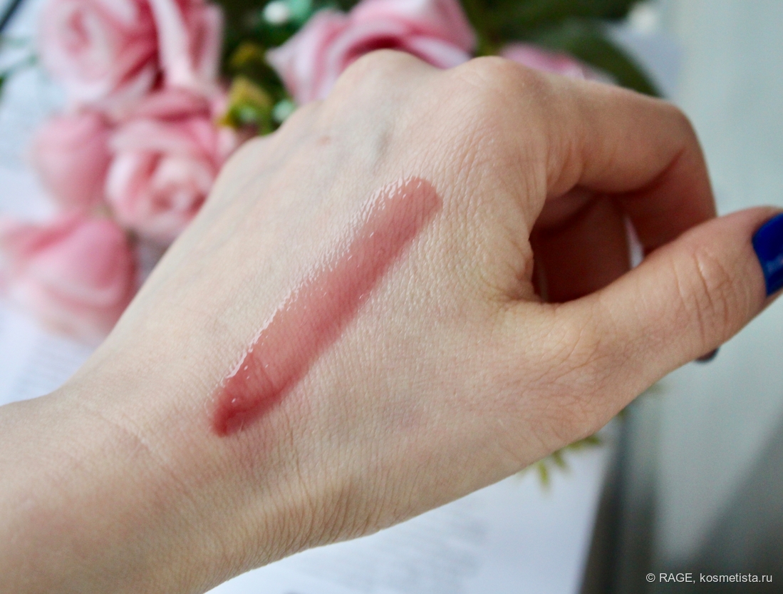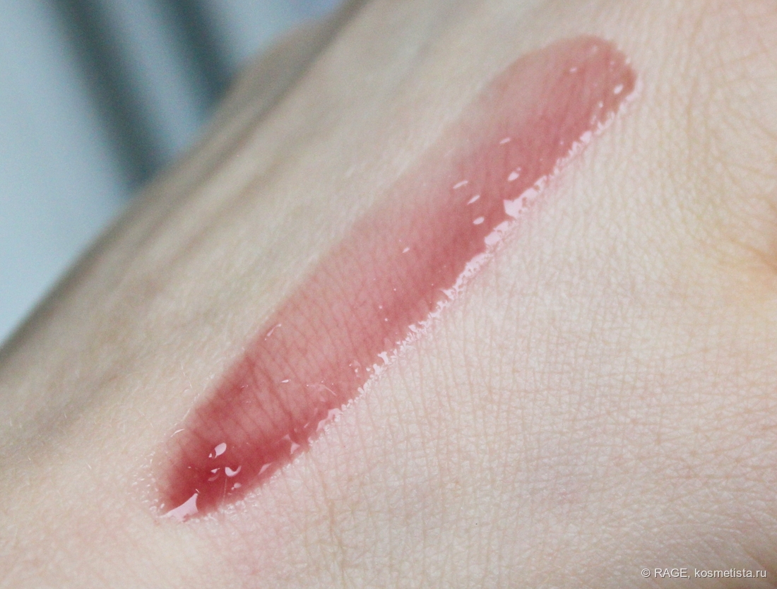Это светло-коричневый блеск с красноватым подтоном, без блёсток и перламутра. Что важно, цвет чистый, не слишком коричневый, а значит, никакой «грязи» на губах не будет.