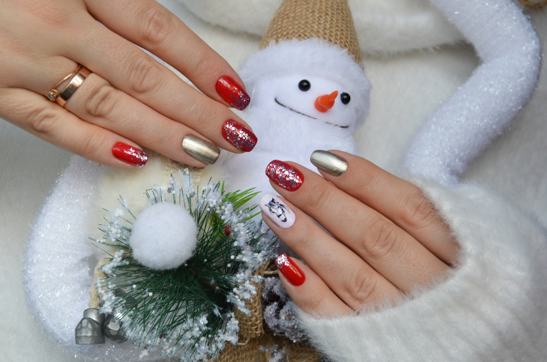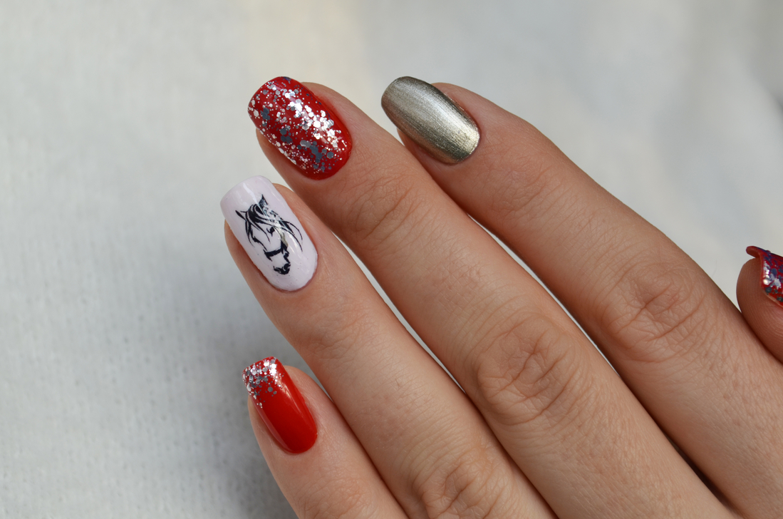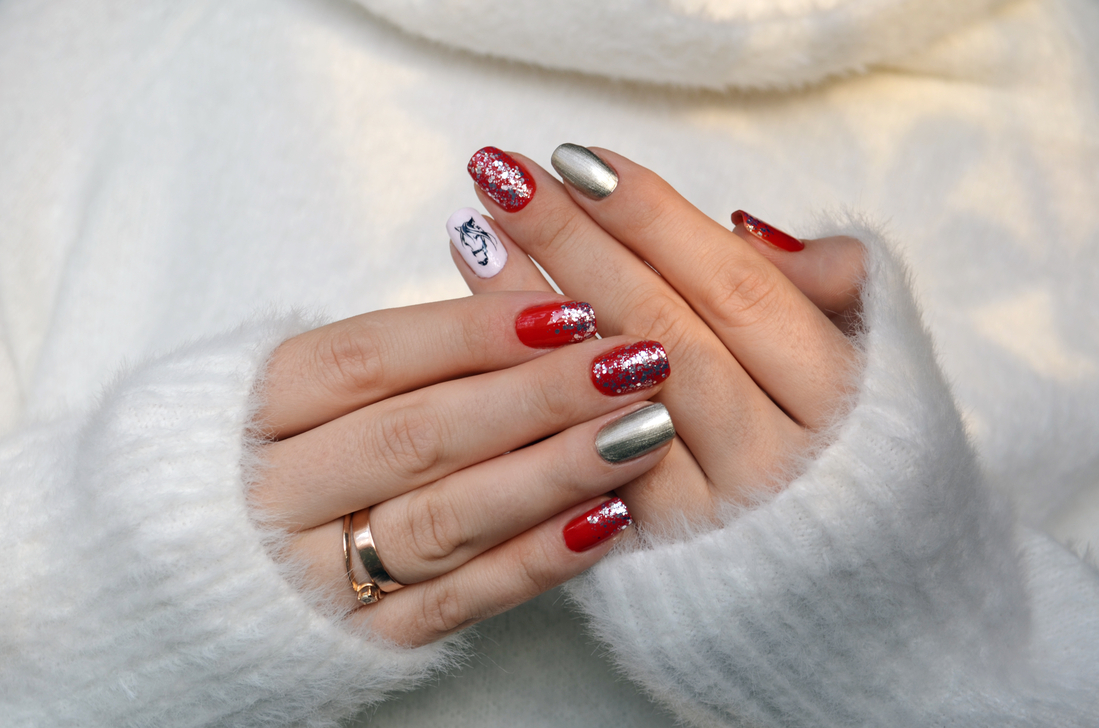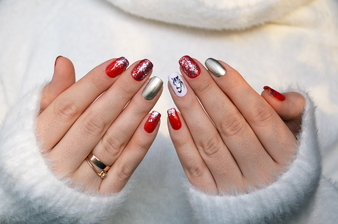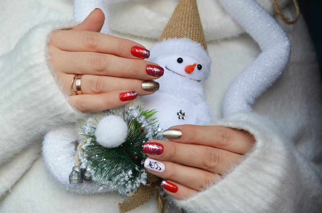 Новогодние цвета — это какие? Красный, белый, серебристый, золотой, хвойный и, пожалуй, синий. У меня такие ассоциации. Но уместить эти все оттенки на десяти пальцах — так себе история, как мне кажется, поэтому я остановилась на красном, белом и серебристом, плюс использовала одну наклеечку.