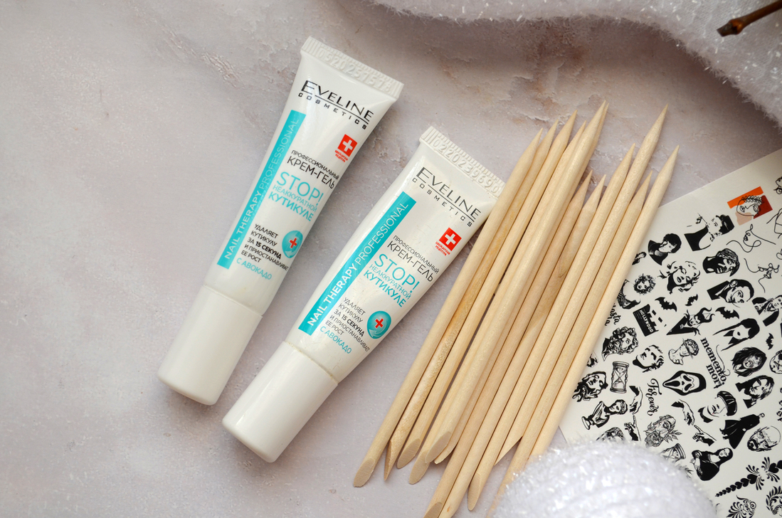 Первым делом я всегда обрабатываю кутикулу. Наношу на нее крем-гель от Eveline, который повторяла раз 100, держу его минуты две, смываю. Беру апельсиновые палочки, отодвигаю кутикулу и срезаю ее ножничками. Потом немного подпиливаю длину стекляной пилочкой. На этом всё.