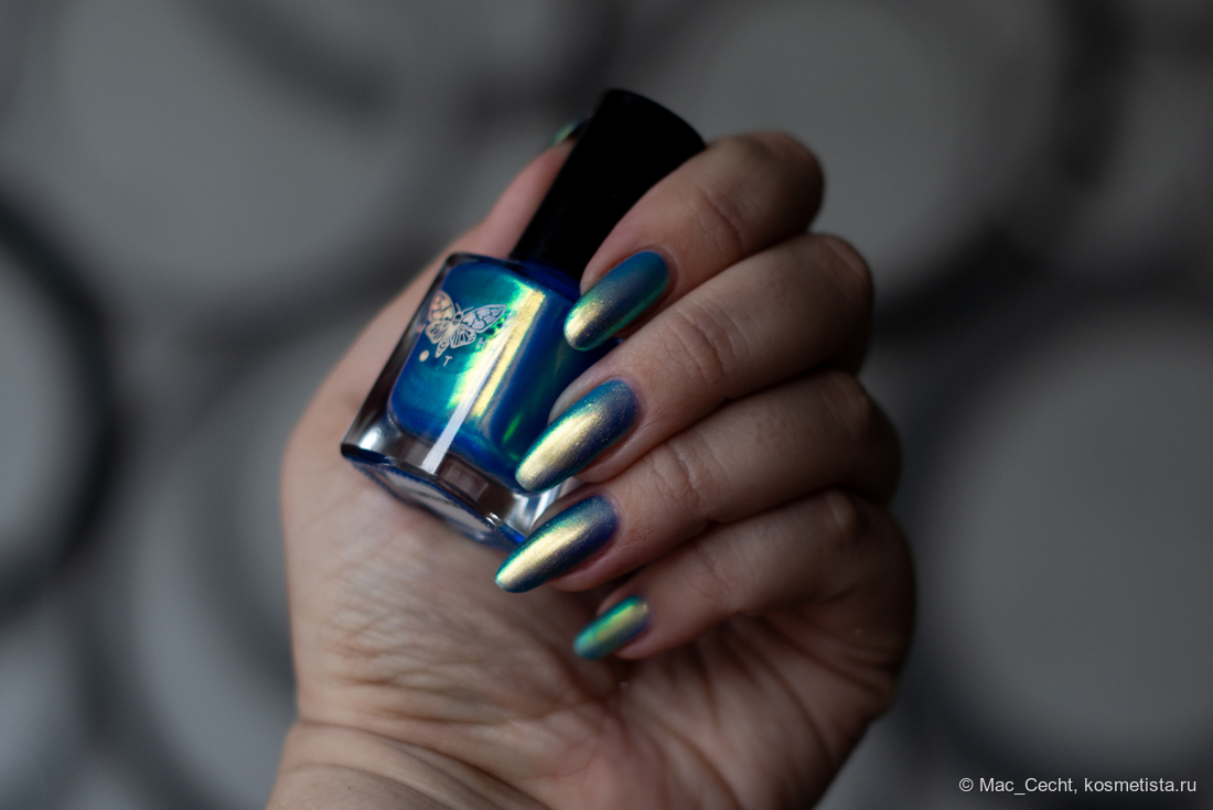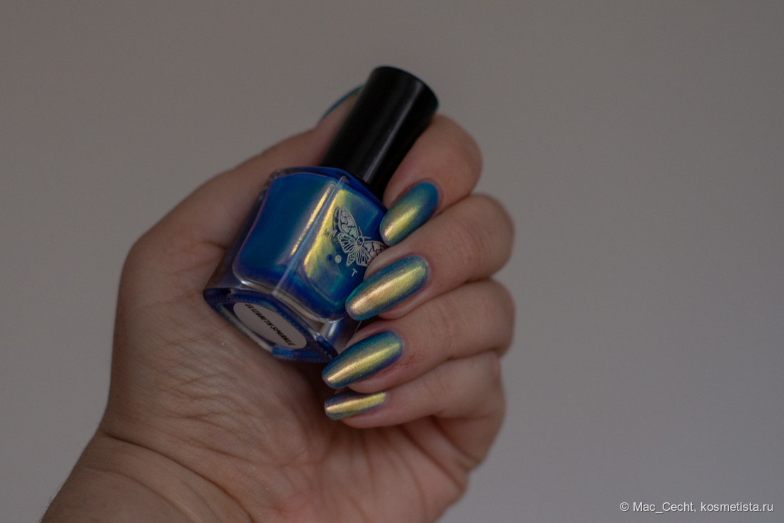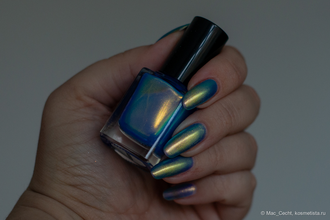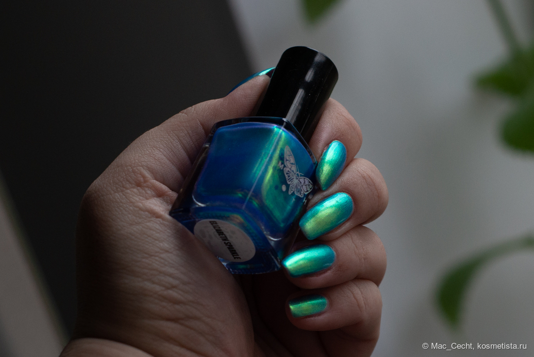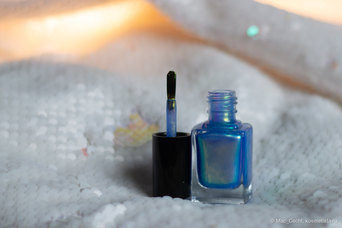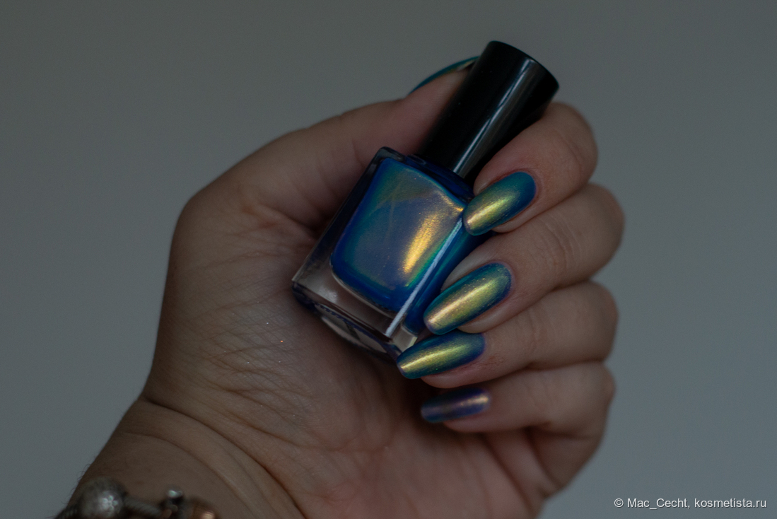 По переливчатости и изменчивости больше всего напоминает Амброзию Полиш Молиш, но в Аброзии крупнее фракция, и другой цветовой замес, хоть и на основе синего.