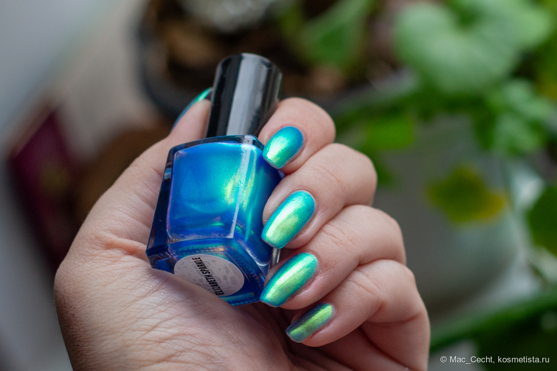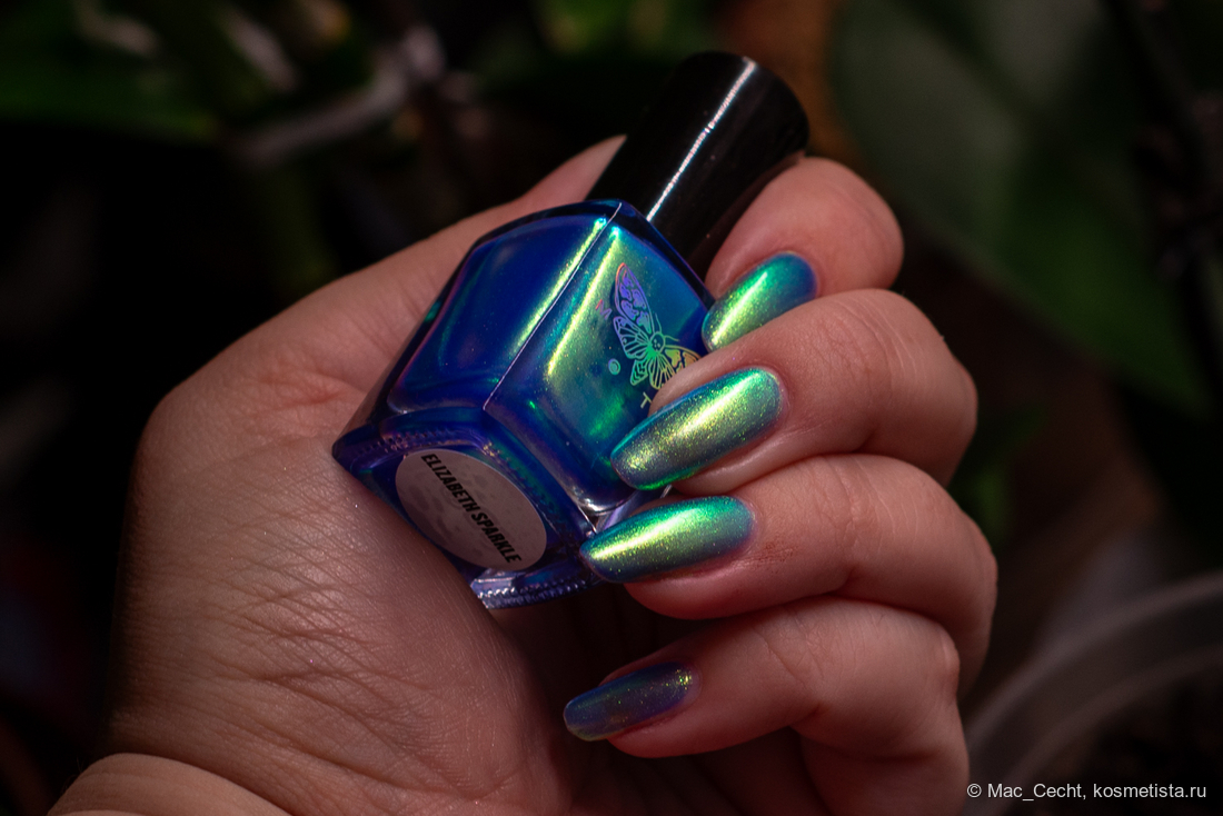 Elisabeth Sparkle — по описанию марки «Голубое желе с обилием искристого золотисто-зелено-бирюзового шиммера». Для желе пигментация достаточно приличная, хотя на мои длинные ногти все равно немного полупрозрачно.