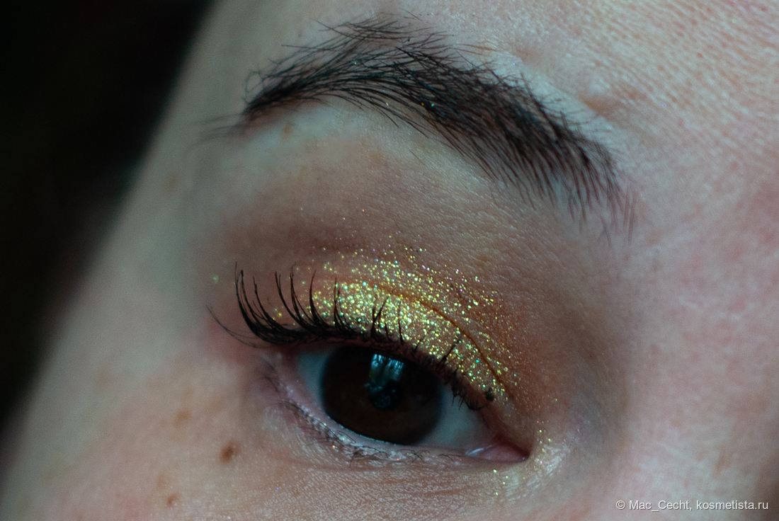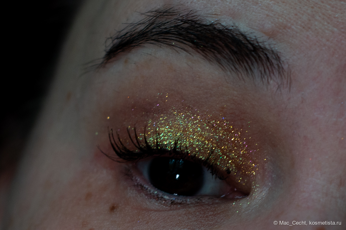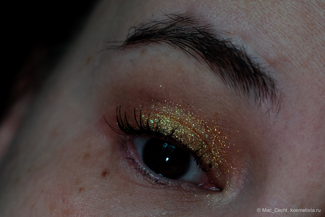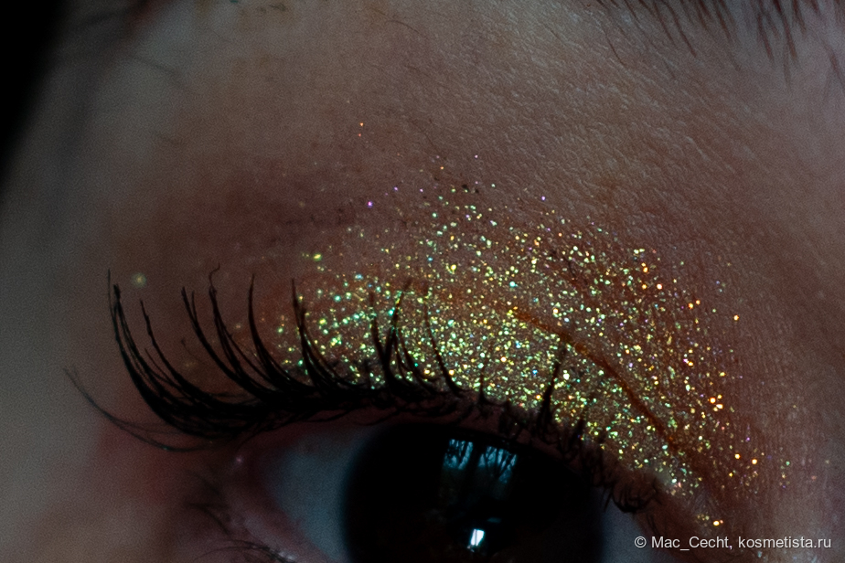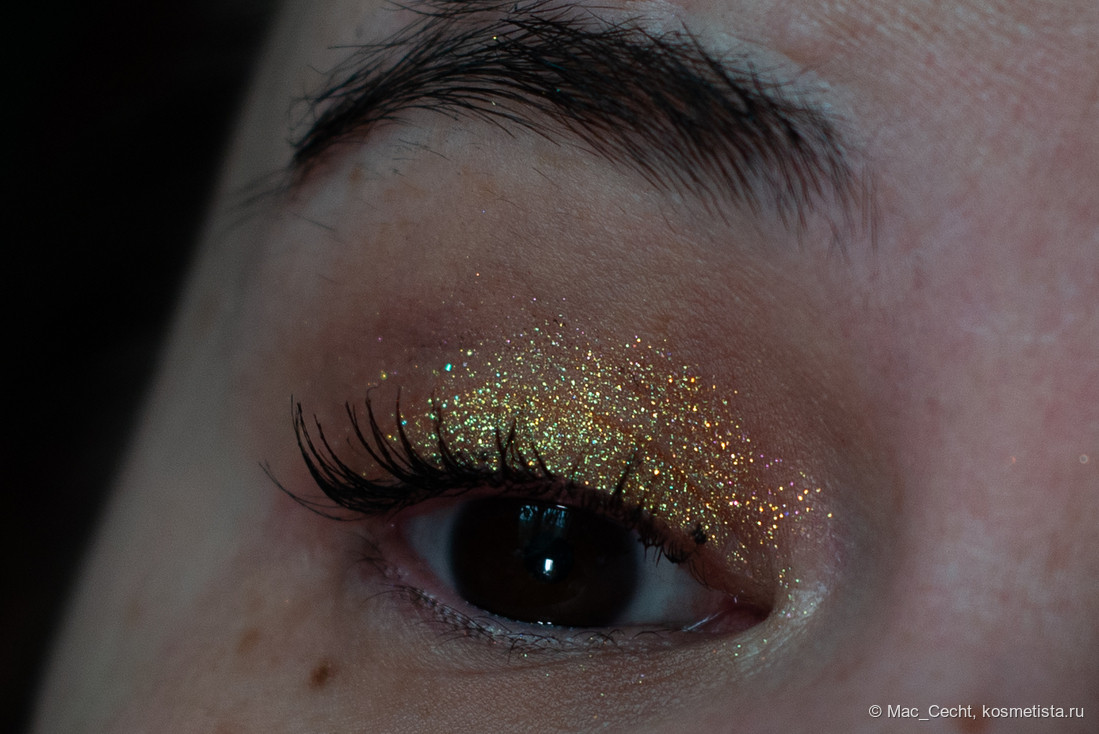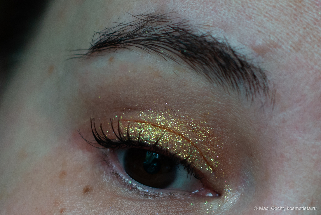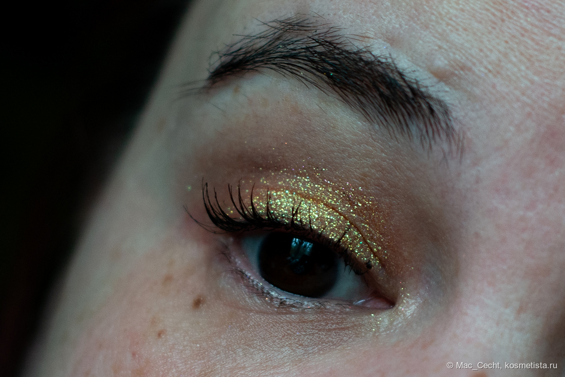 Текстура — шиммер. Не летучий, но требует базы, с голой кожи можно просто сдуть. И осыпается в процессе нанесения. Под глазами держится уверенно 😂