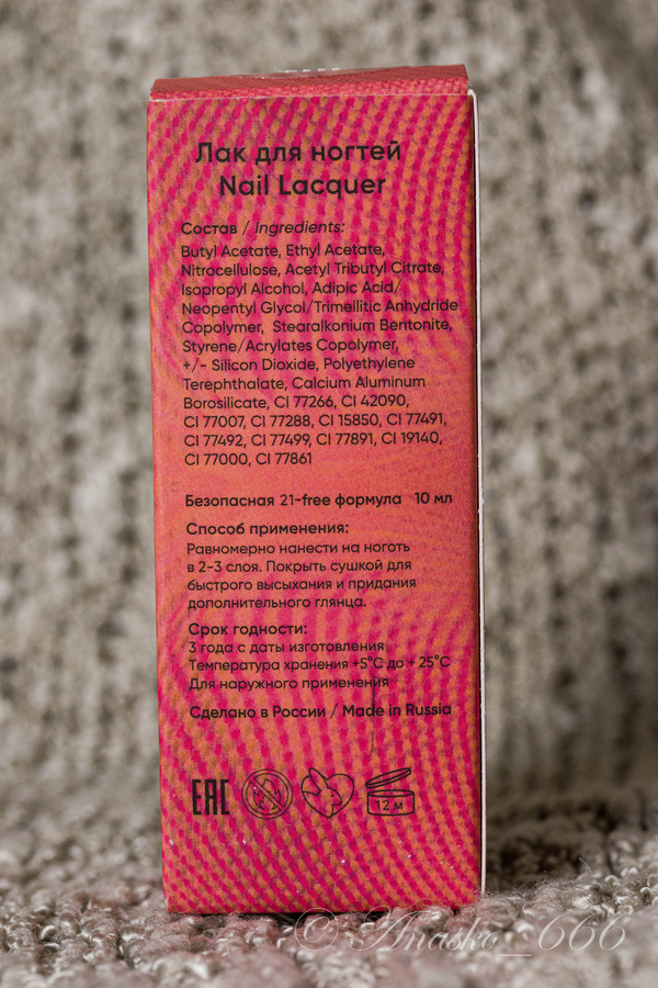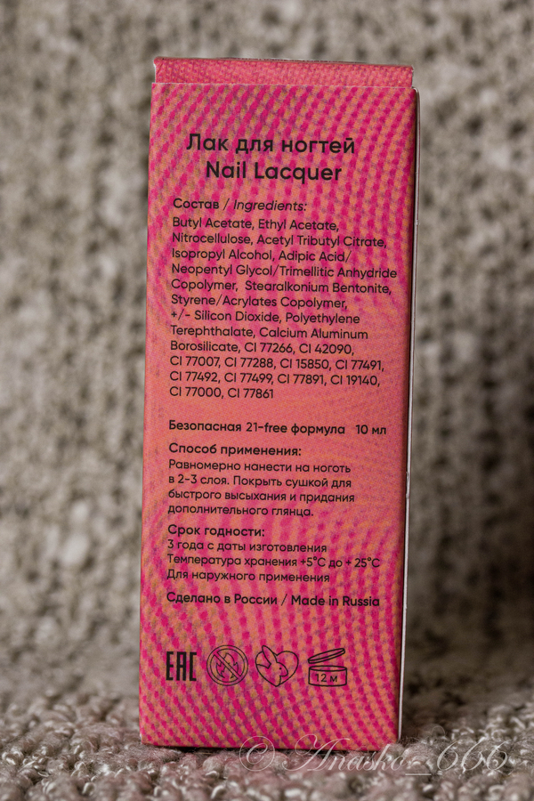 Наносить лак одно удовольствие: ни полос, ни плешей (кроме первого слоя, но даже там неоднородность видна больше на просвет). Сохнет не очень быстро, если нанести топ слишком рано лак может подстянуться с кончиков, но это происходит с большинством лаков, если топ-сушку наносить прям сразу. На мне лак держиться дней 5, и для меня это очень приличная стойкость покрытие мне как правило надоедает дня за два...