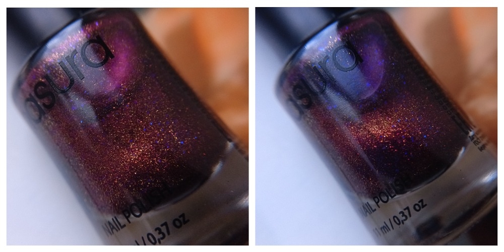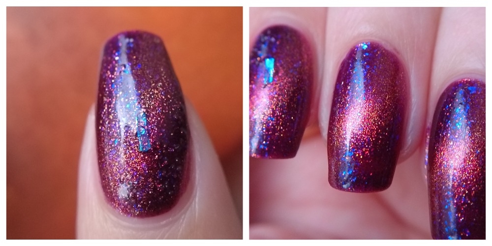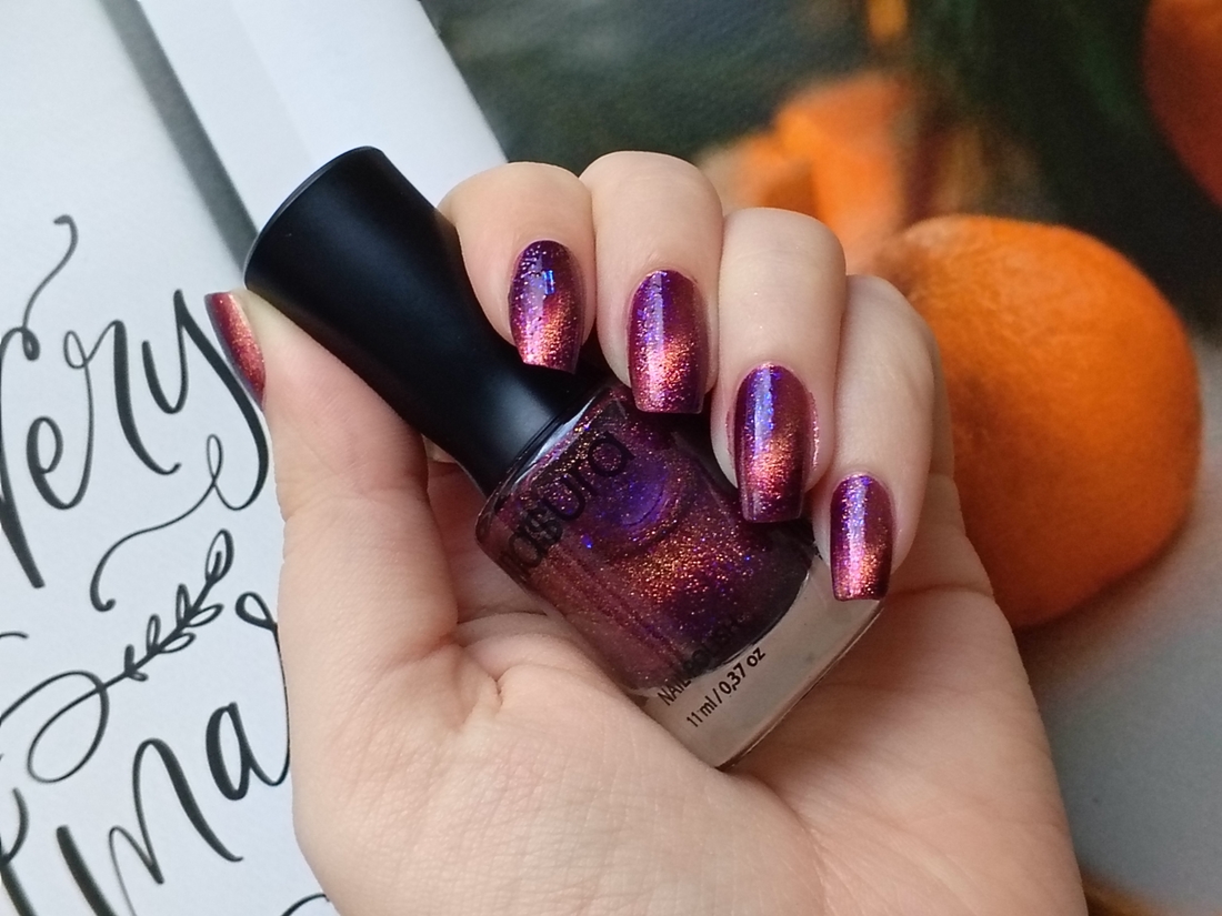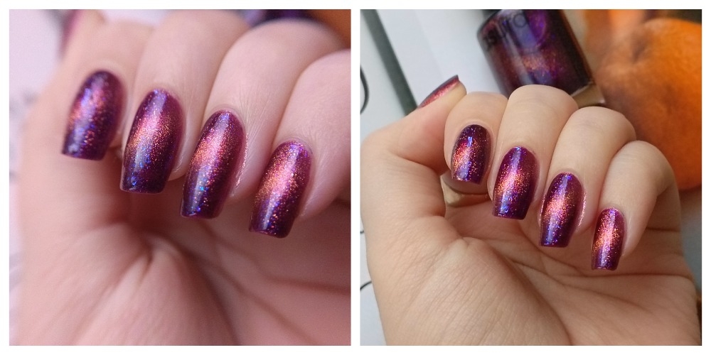 Оттенок заявлен как фиолетовый с яркой синей слюдой и ярким мультихромным (золотисто-персиково-бронзовым) магнитным бликом. В целом я согласна с описанием. Стоит сказать, что за счет теплого магнитного блика и общий тон кажется теплым. Хотя слюда прямо электрическая синяя.