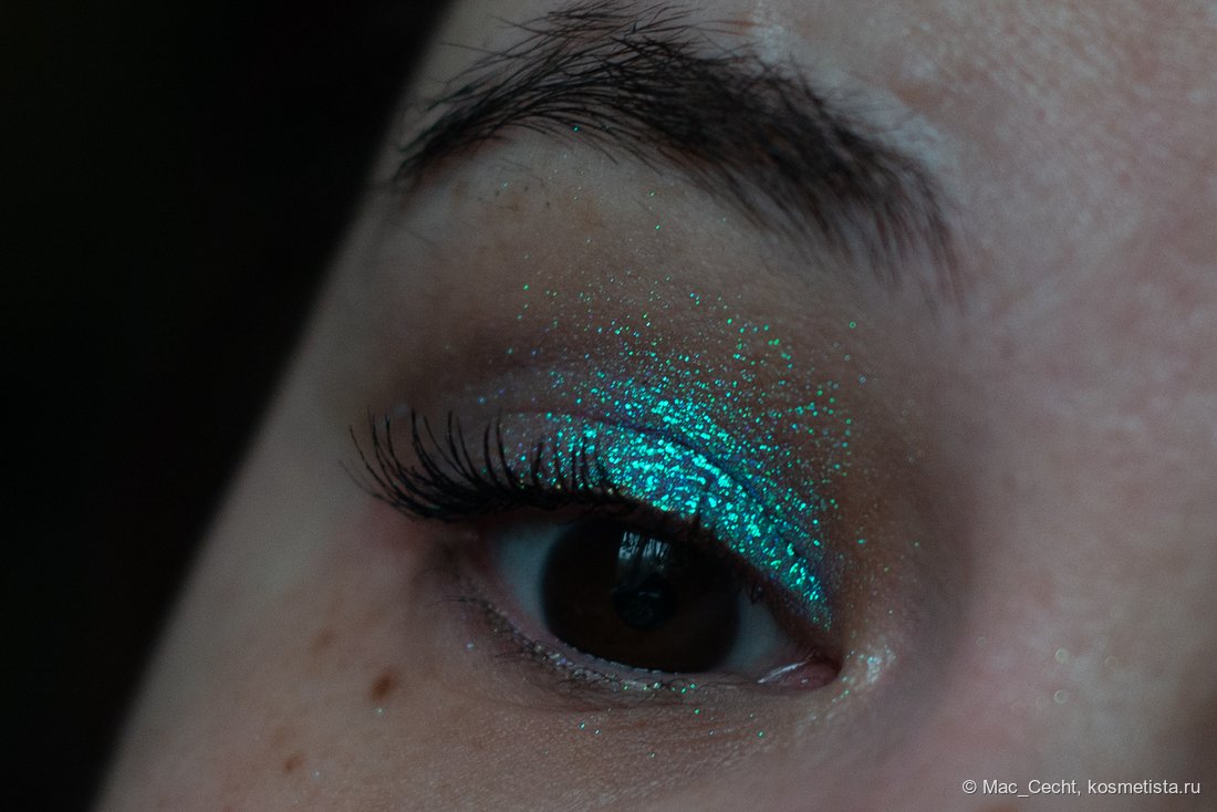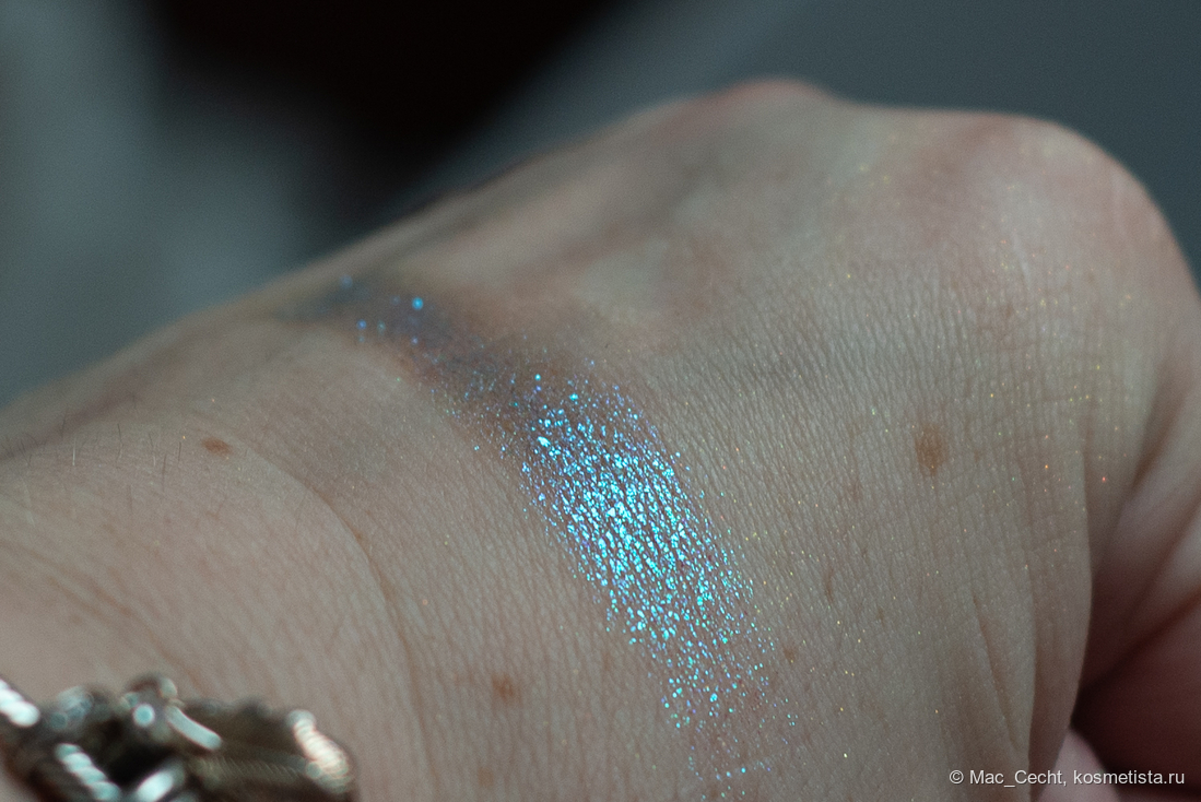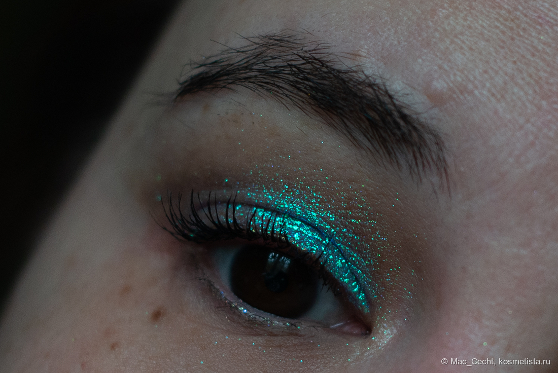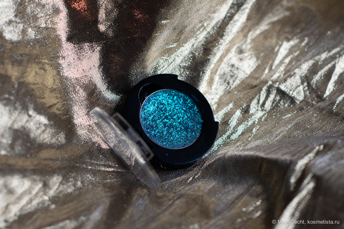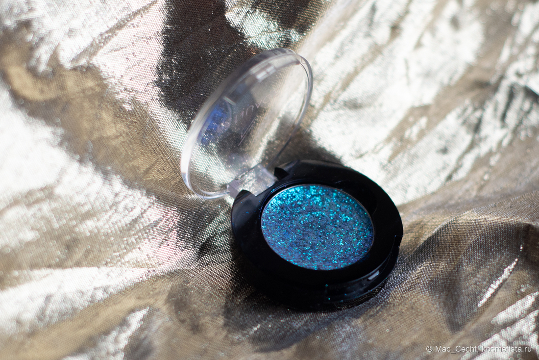 Это роскошные тени! Очень яркие и праздничные, сияют на все сто. При нанесении могут осыпаться, если цепляться за ресницы, думаю, будут осыпаться с кисти (я наношу пальцем). Они создают, по сути, фольгированное покрытие, но из-за прозрачности базы может создаваться эффект, близкий к блику.