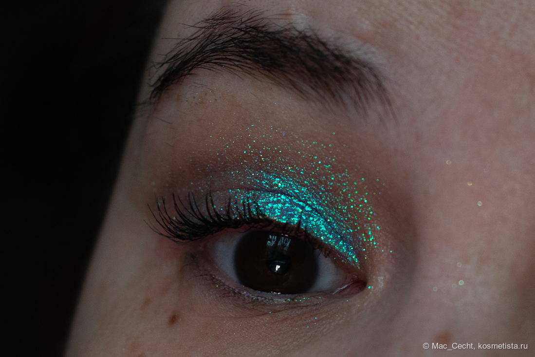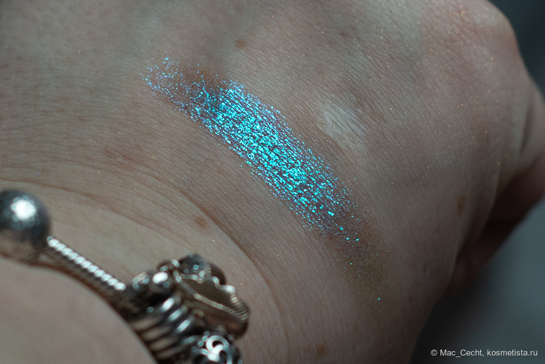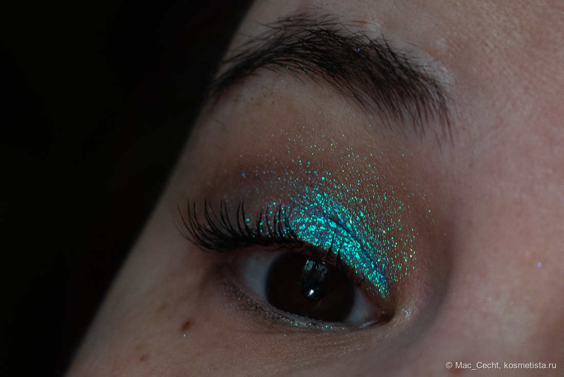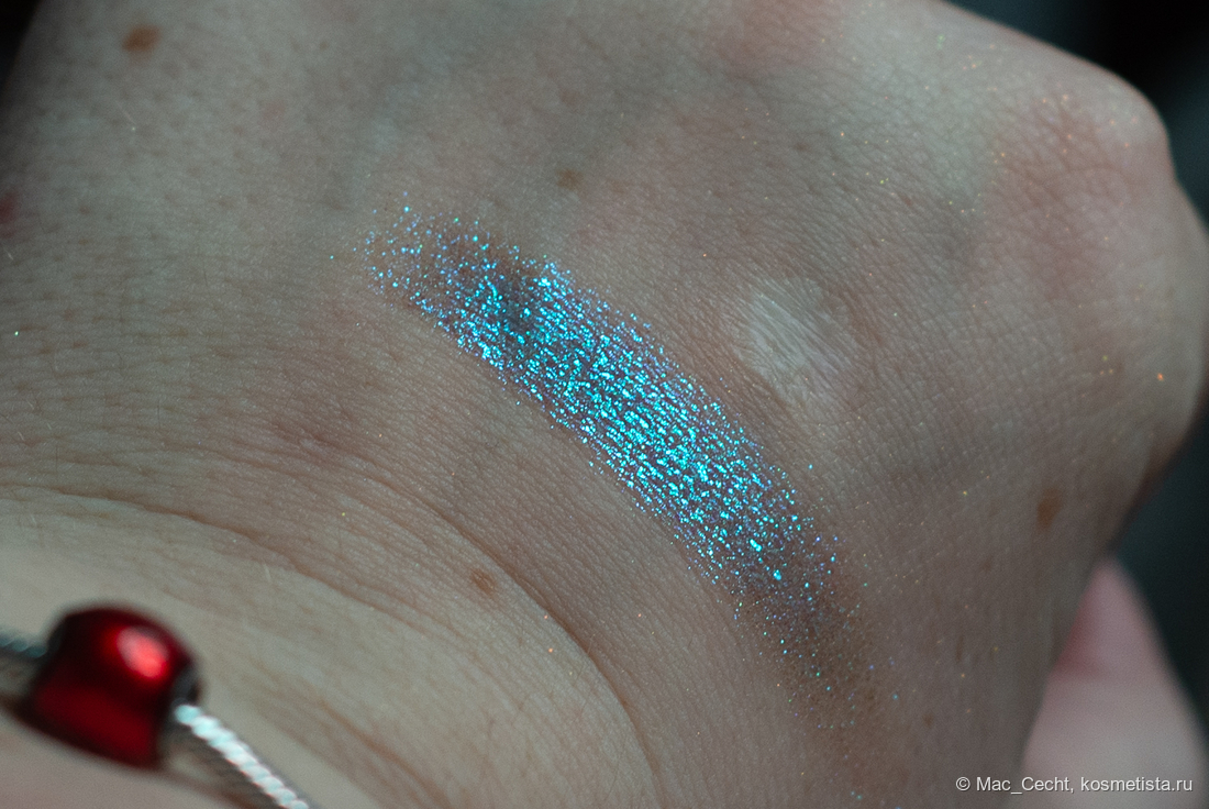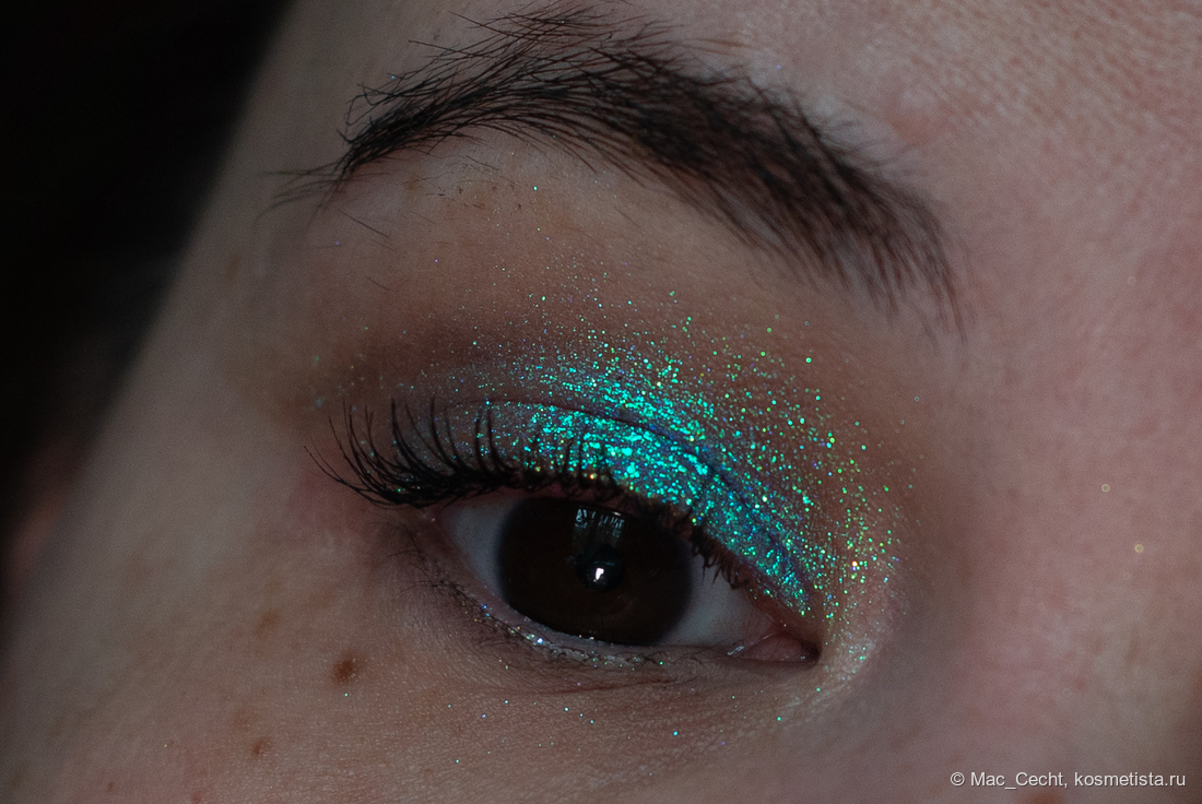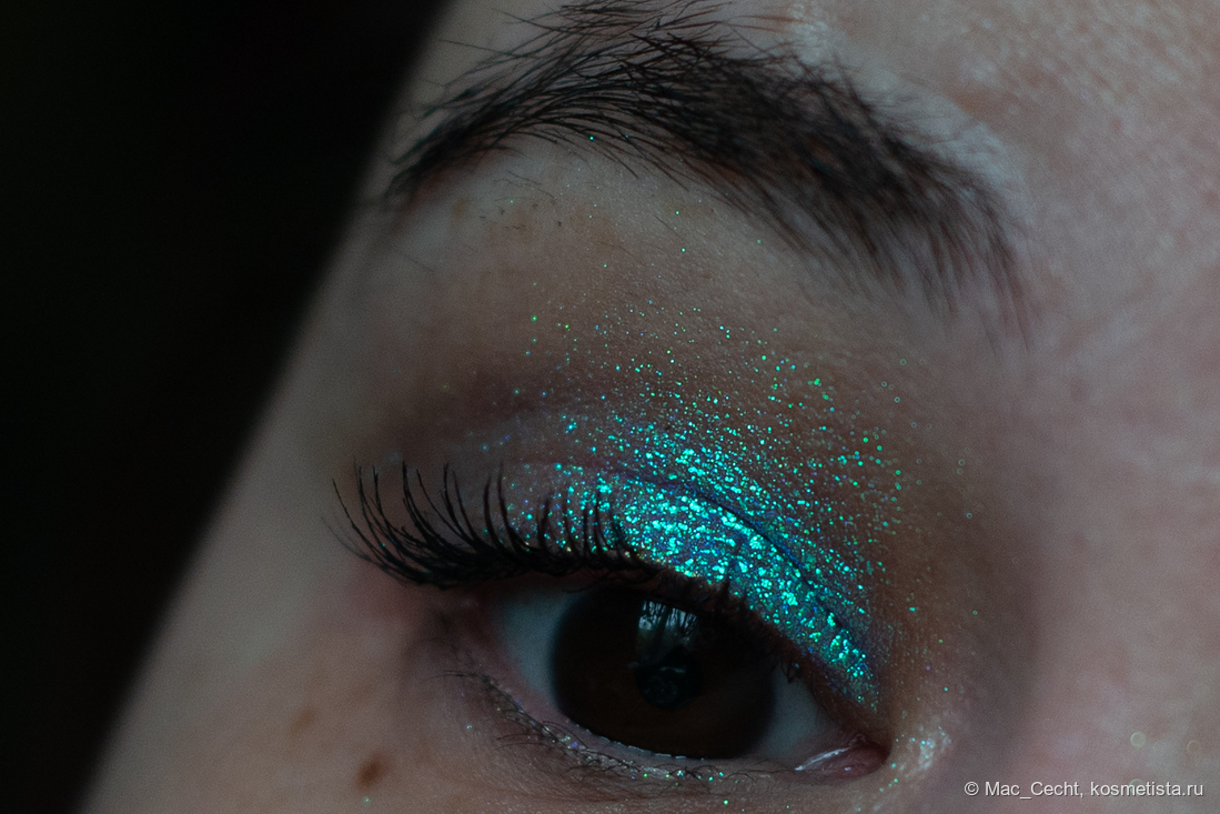 Это роскошные тени! Очень яркие и праздничные, сияют на все сто. При нанесении могут осыпаться, если цепляться за ресницы, думаю, будут осыпаться с кисти (я наношу пальцем). Они создают, по сути, фольгированное покрытие, но из-за прозрачности базы может создаваться эффект, близкий к блику.