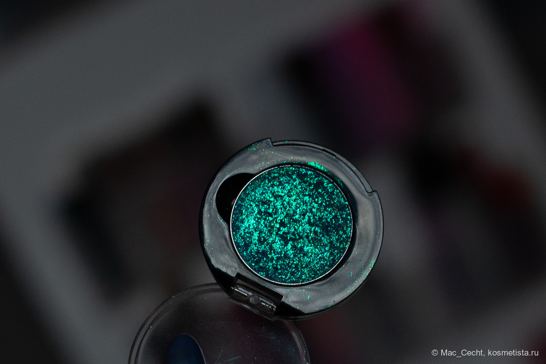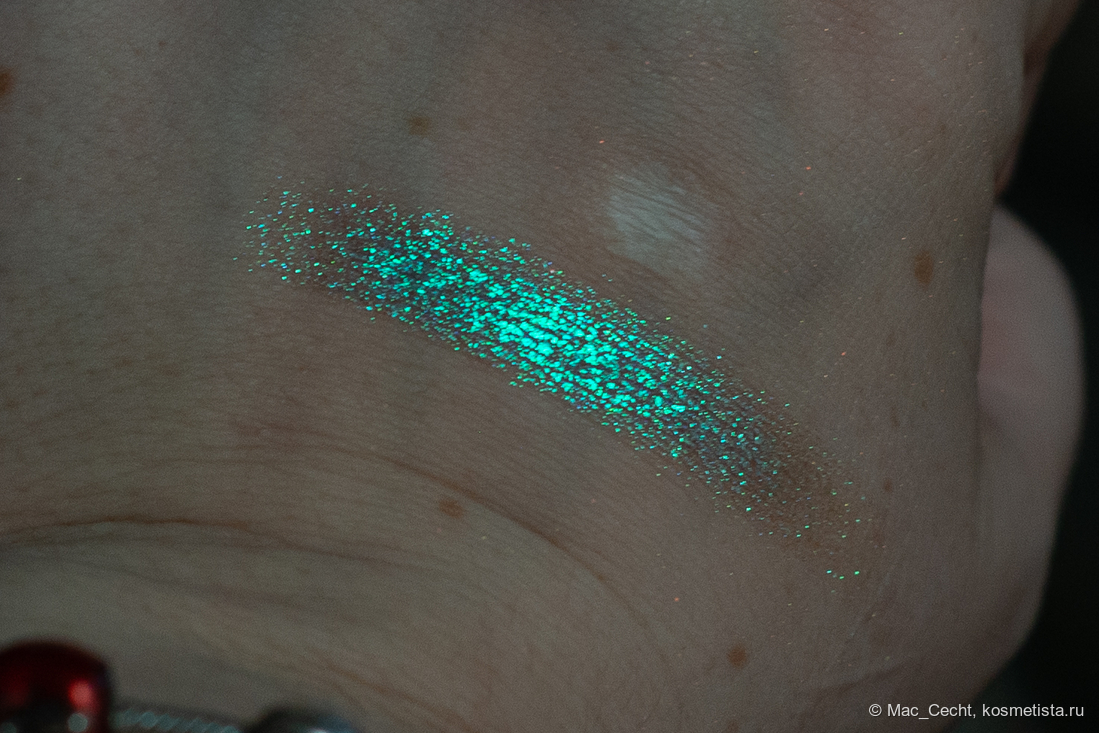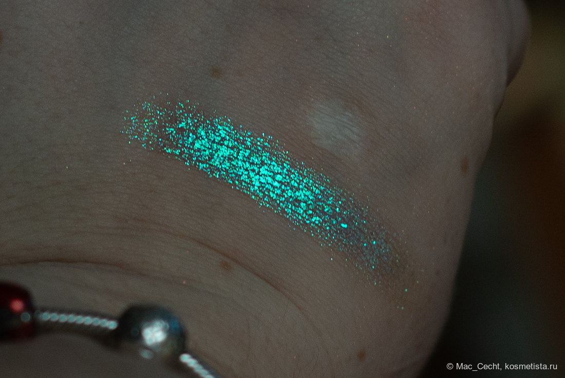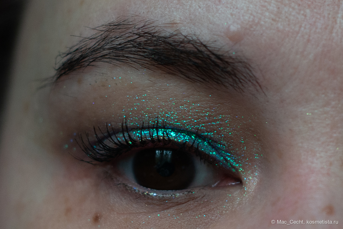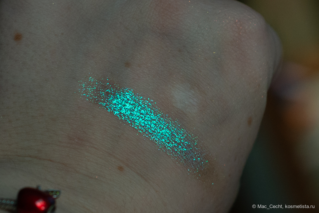 Это роскошные тени! Очень яркие и праздничные, сияют на все сто. При нанесении могут осыпаться, если цепляться за ресницы, думаю, будут осыпаться с кисти (я наношу пальцем). Они создают, по сути, фольгированное покрытие, но из-за прозрачности базы может создаваться эффект, близкий к блику.