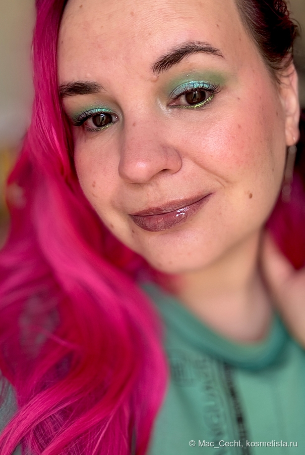 Сложно показывать тени на себе, с нависшими веками их просто нет. Здесь плохо растушевались зеленые и оказались не той температуры. Но для примерного представления.