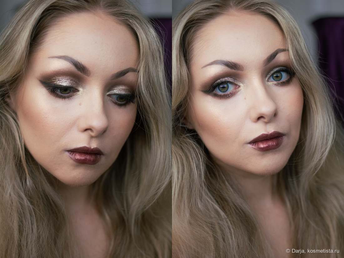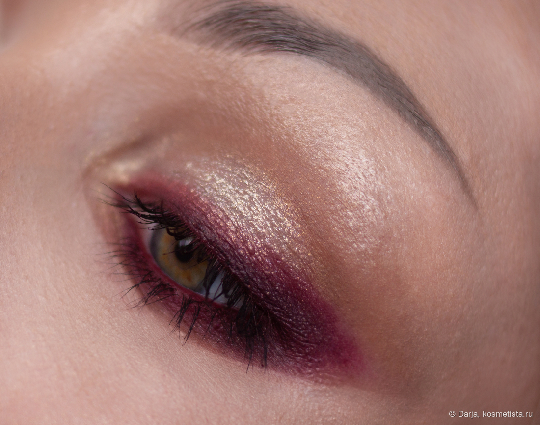 Позитивное в этой ситуации только то, что шиммер так играет на веках, что небольшие скатывания почти незаметны. Даже к крупному плану на фото нужно приглядываться, чтобы увидеть скатывание. Но я думаю, что нависшее и/или жирное веко такой недостаток не простит, шиммер не спасёт. Дополнительно отмечу, что если нанести тени плотным слоем, как на фото выше, лучше не тереть веки, иначе покрытие ещё и может потрескаться.
