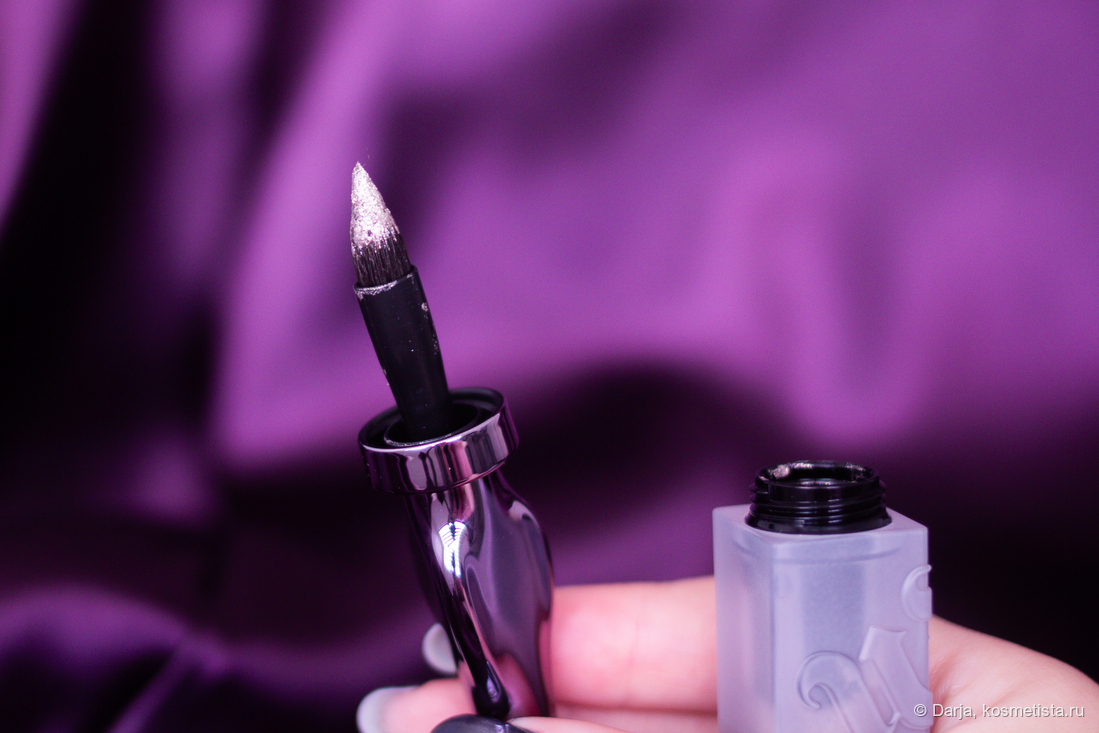 Вместо привычного спонжа для жидких теней во флаконе нас ждёт мягкая кисточка с длинным ворсом. Ограничитель достаточно глубокий, в тени погружается только нижняя часть короткой кисти.
