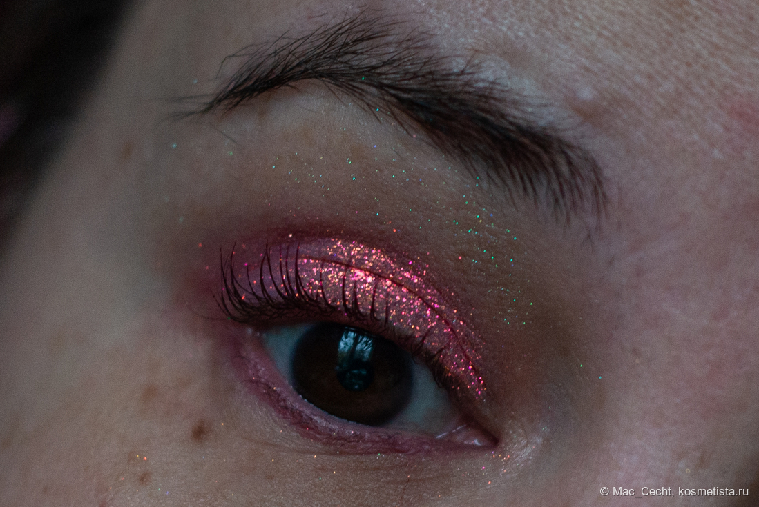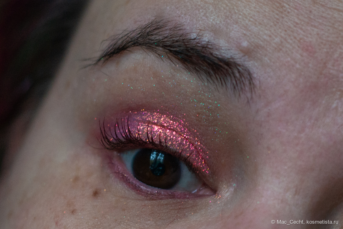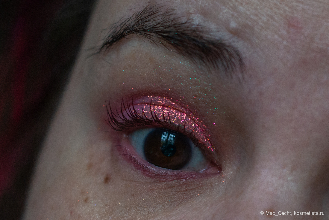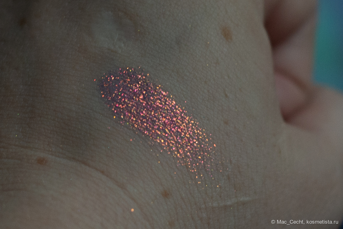 Тени не склеиваются между собой, рассыпчатый порошок в банке. Но после нанесения специально не убирала осыпания, как видите, их мало. Однако обсыпаться легко — они прям любят цепляться за ресницы и на коже сидят цепко, мелкие осыпания не смахнешь, да и влажной салфеткой придется повозиться.