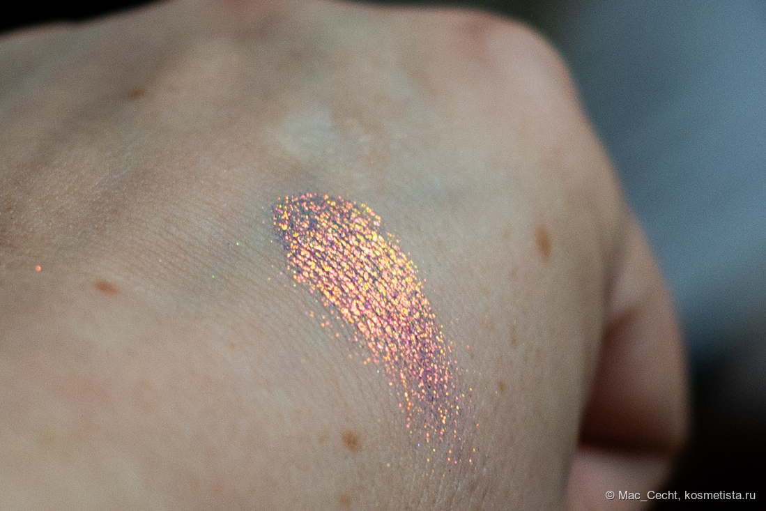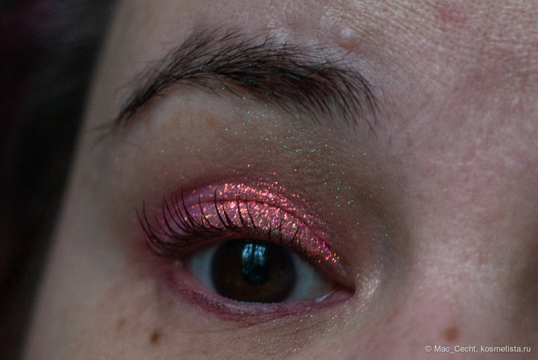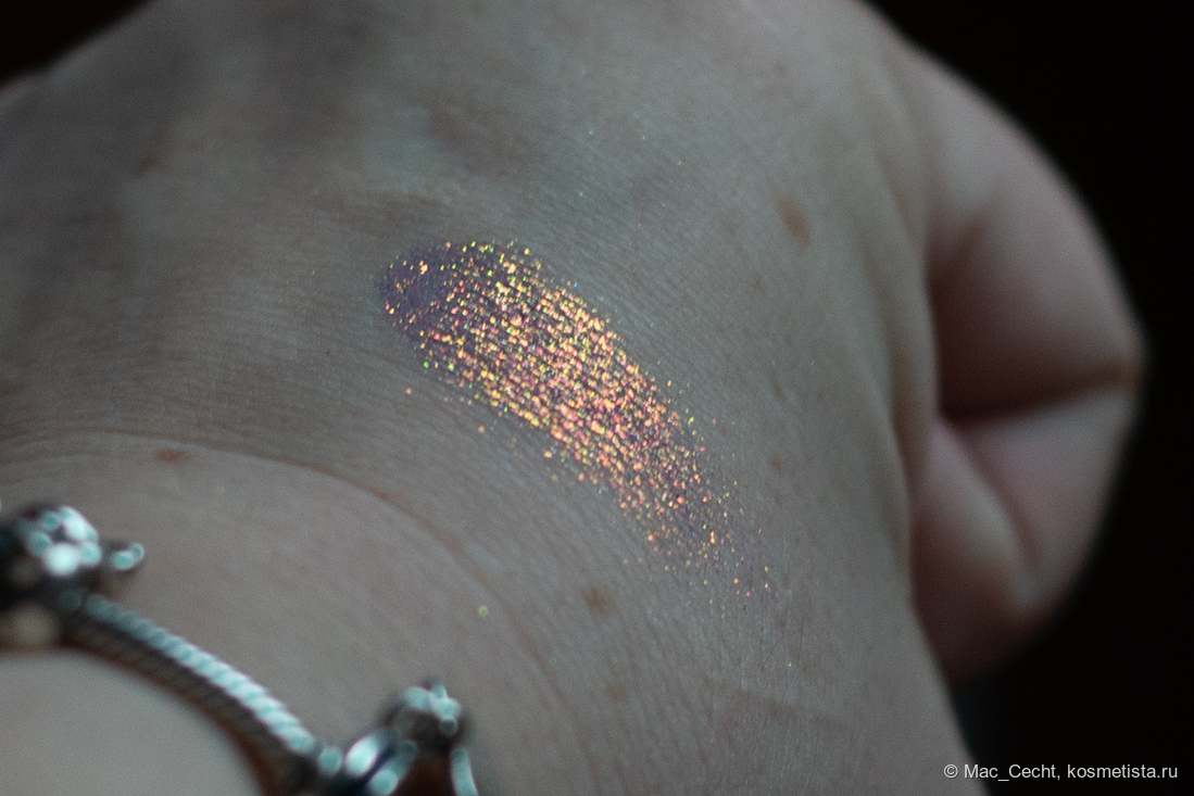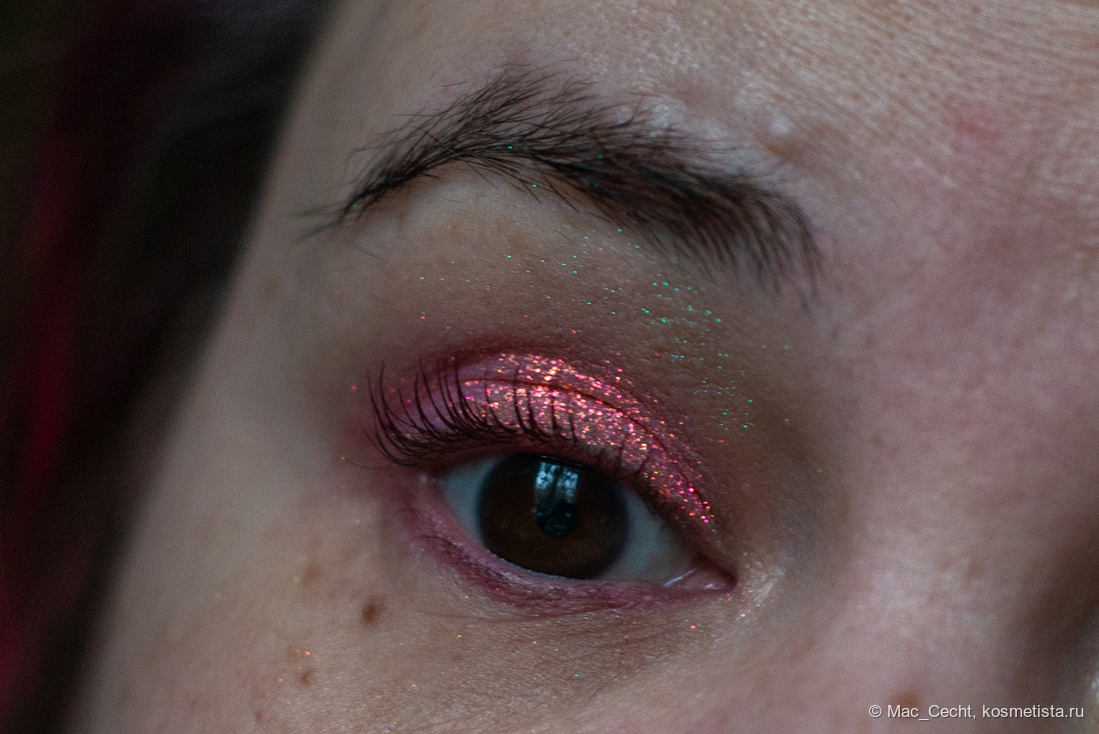 Тени не склеиваются между собой, рассыпчатый порошок в банке. Но после нанесения специально не убирала осыпания, как видите, их мало. Однако обсыпаться легко — они прям любят цепляться за ресницы и на коже сидят цепко, мелкие осыпания не смахнешь, да и влажной салфеткой придется повозиться.