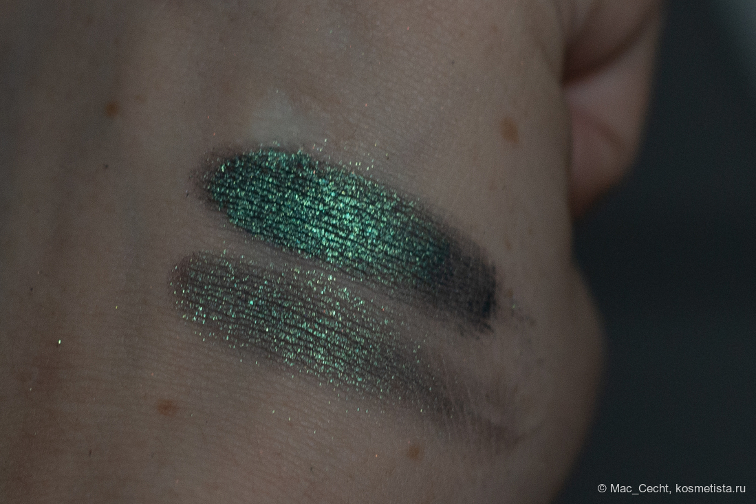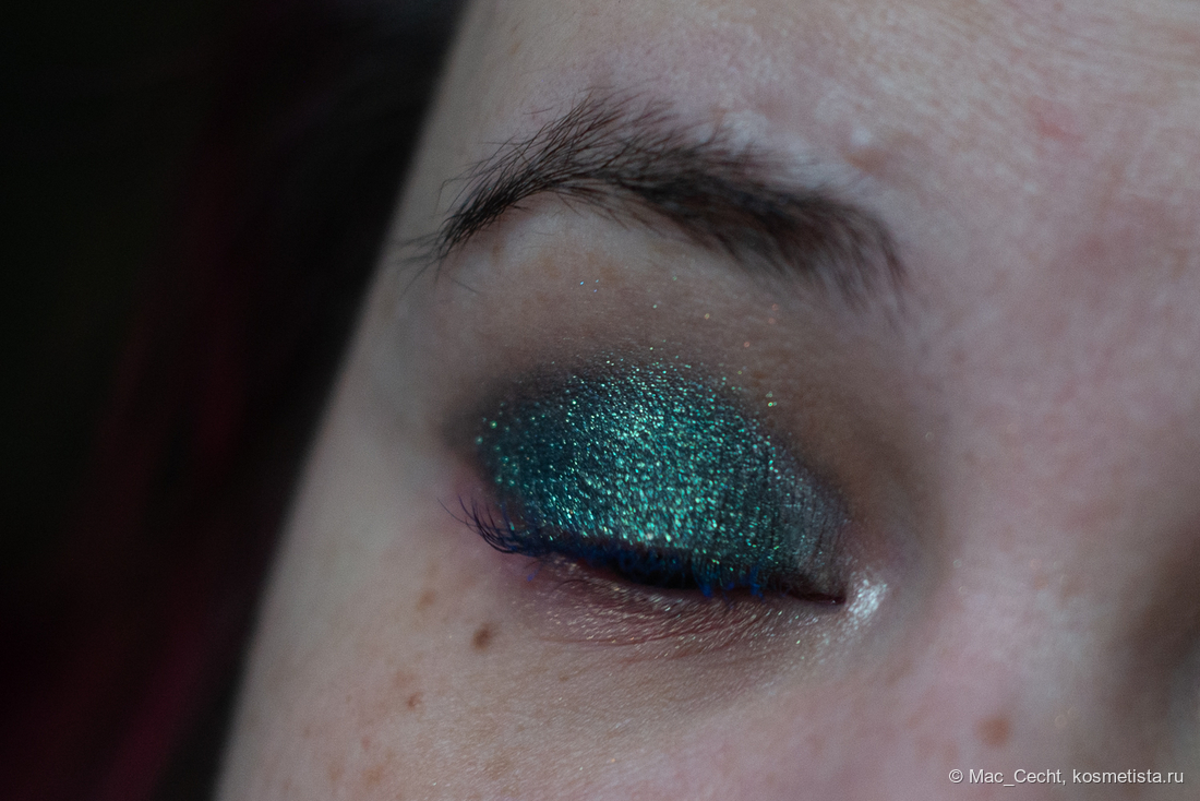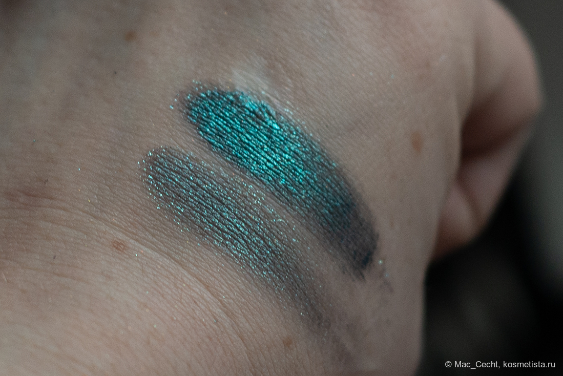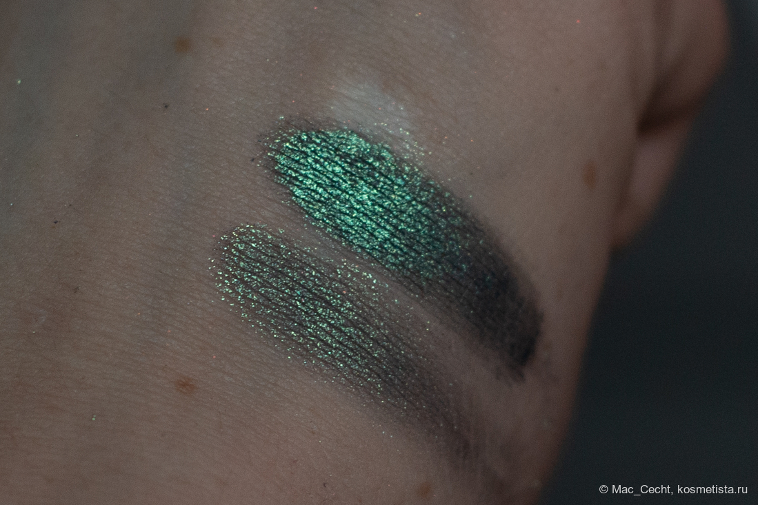 Тени сыпучие, так что наносить нужно аккуратно. И с кожи до конца удаляются сложно — остается мелкий зеленый шиммер на коже, тут или скотч, или хорошее умывание.