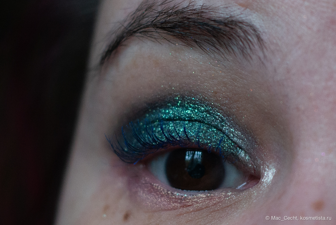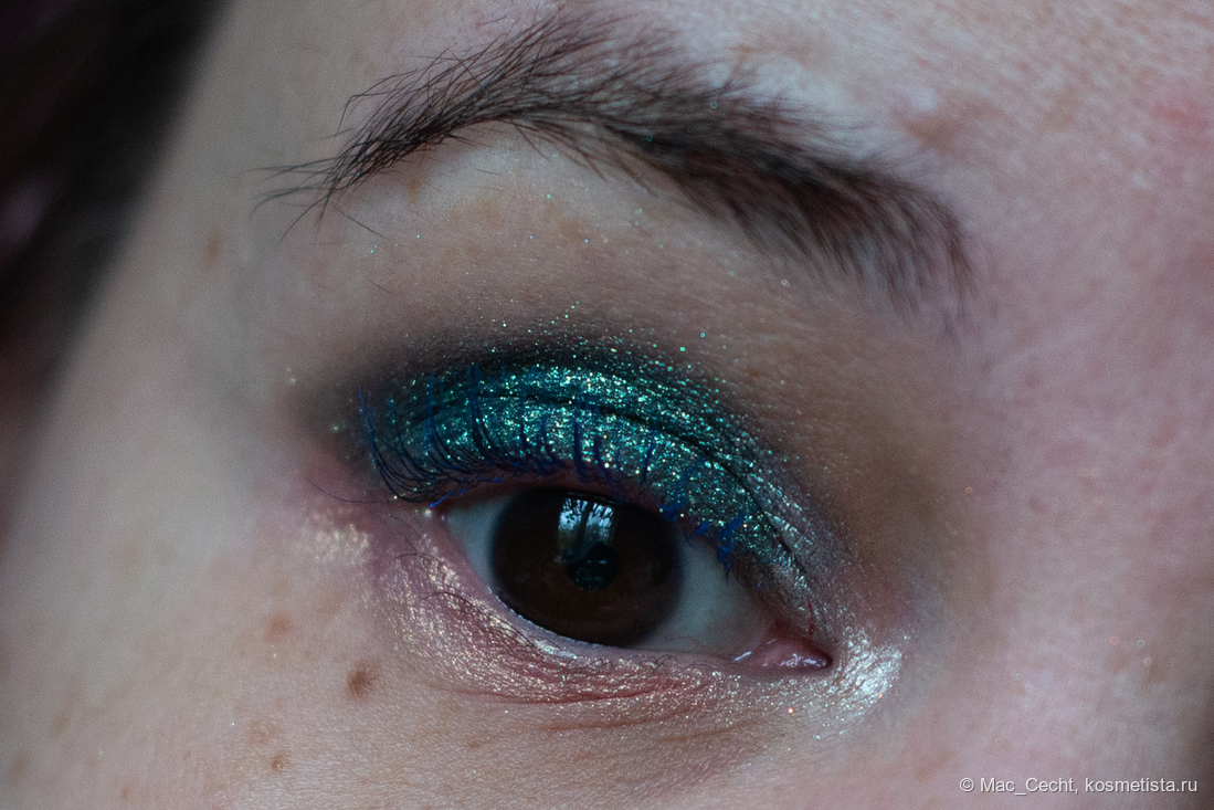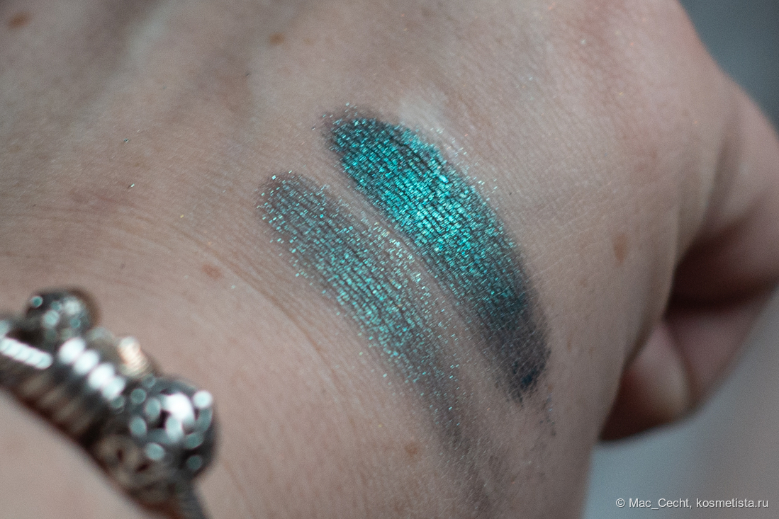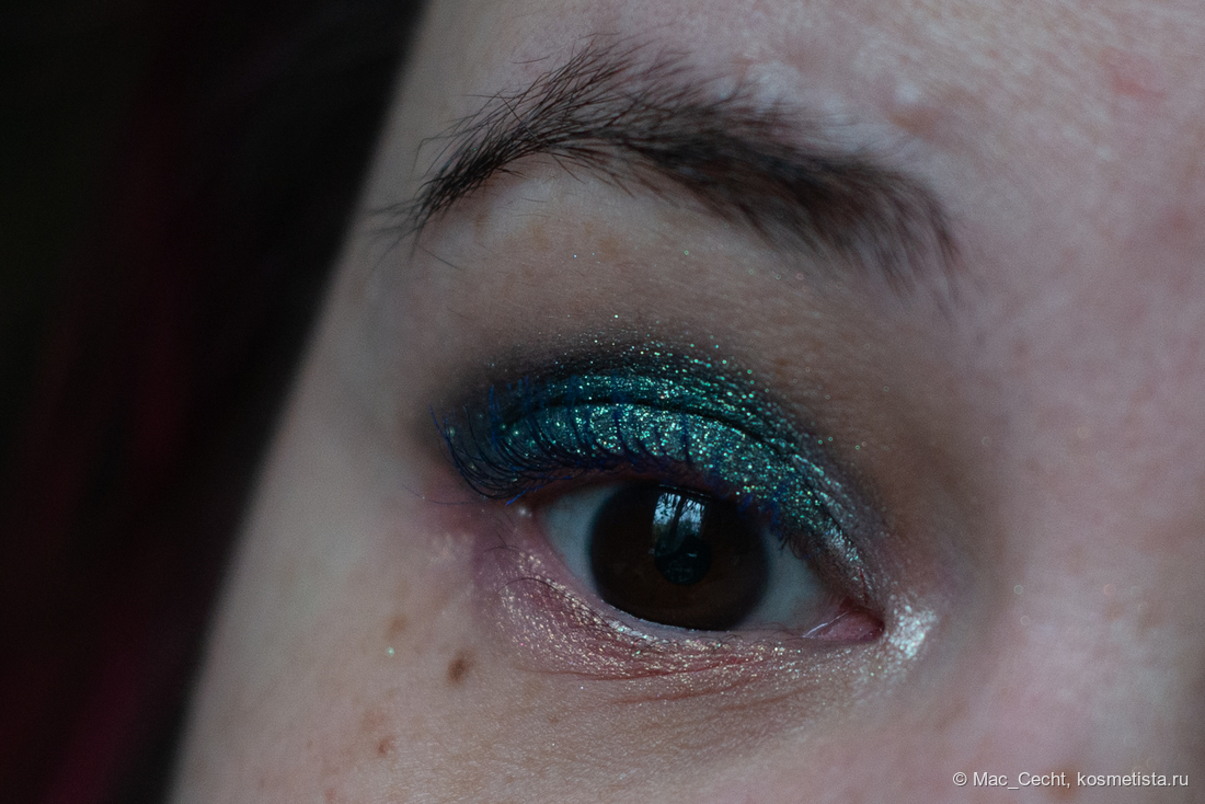 Тени сыпучие, так что наносить нужно аккуратно. И с кожи до конца удаляются сложно — остается мелкий зеленый шиммер на коже, тут или скотч, или хорошее умывание.