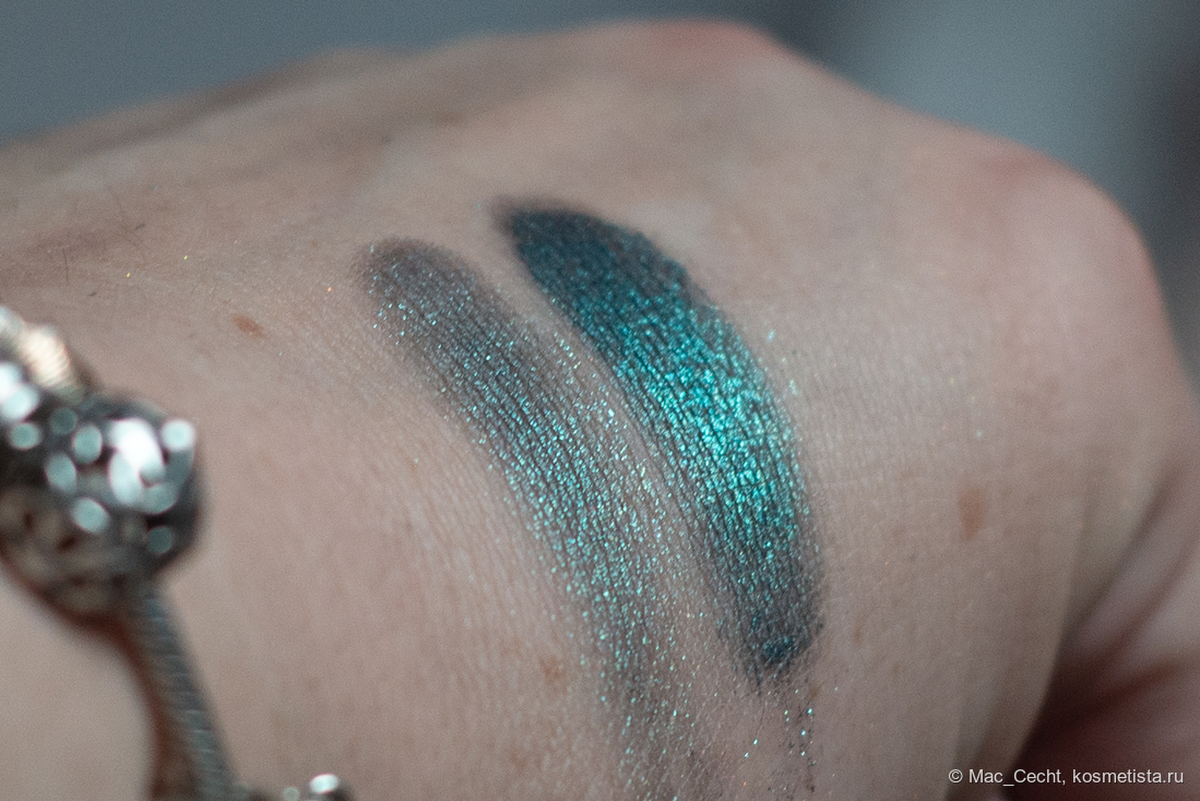 Если смотреть на официальные свотчи, то там слишком много травяной зелени. У Собирательницы душ есть тиловая сторона, есть изумрудная, но обе они немного приглушенные и на сероватой базе.